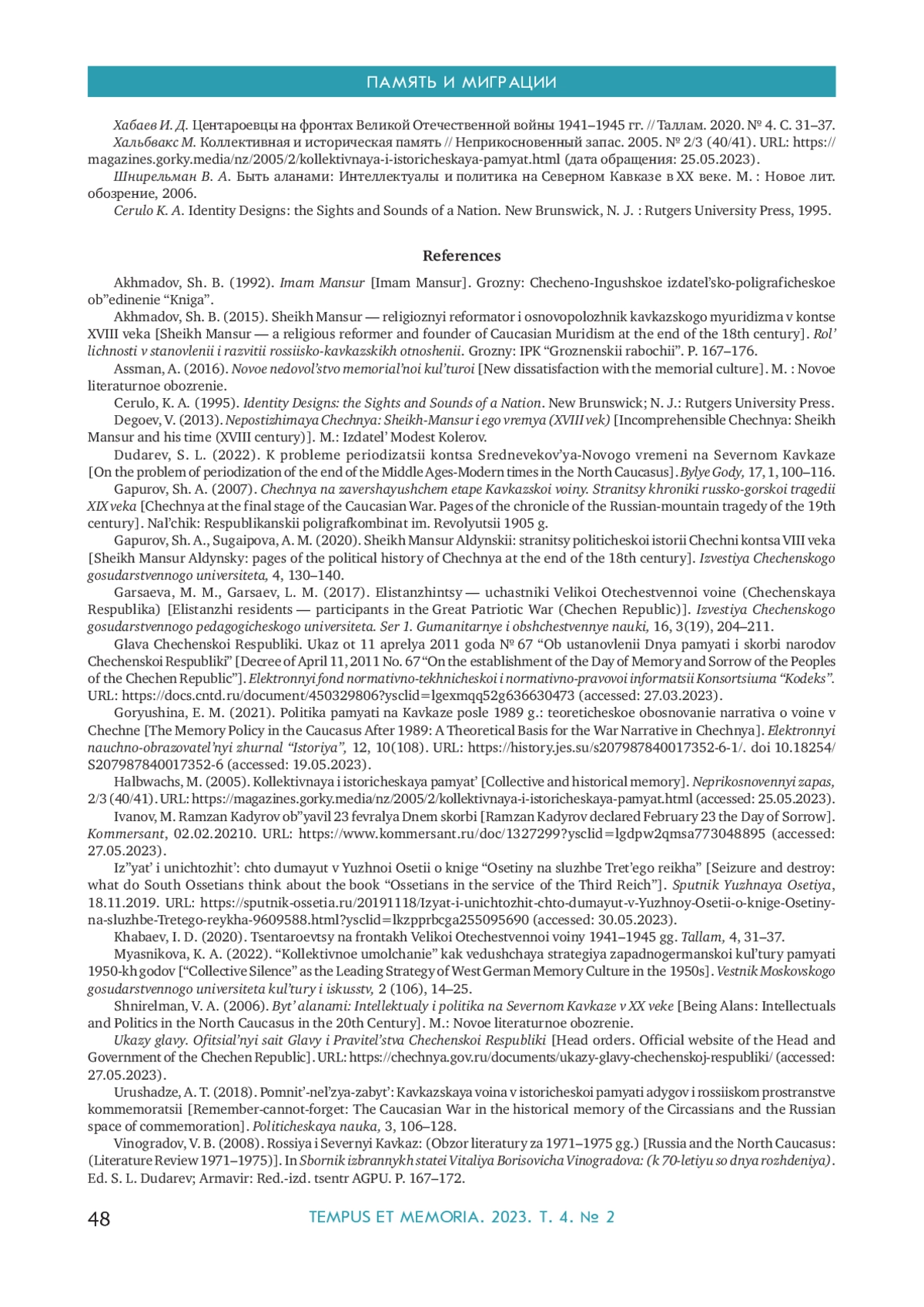 9. Горюшина Е. М. Политика памяти на Кавказе после 1989 г.: теоретическое обоснование нарратива о войне в Чечне // Электронный научно-образовательный журнал “История”. 2021. T. 12, вып. 10 (108). URL: https://history.jes.su/s207987840017352-6-1/. 10.18254/S207987840017352-6 (дата обращения: 19.05.2023). DOI: 10.18254/S207987840017352-6( EDN: EUBRAT