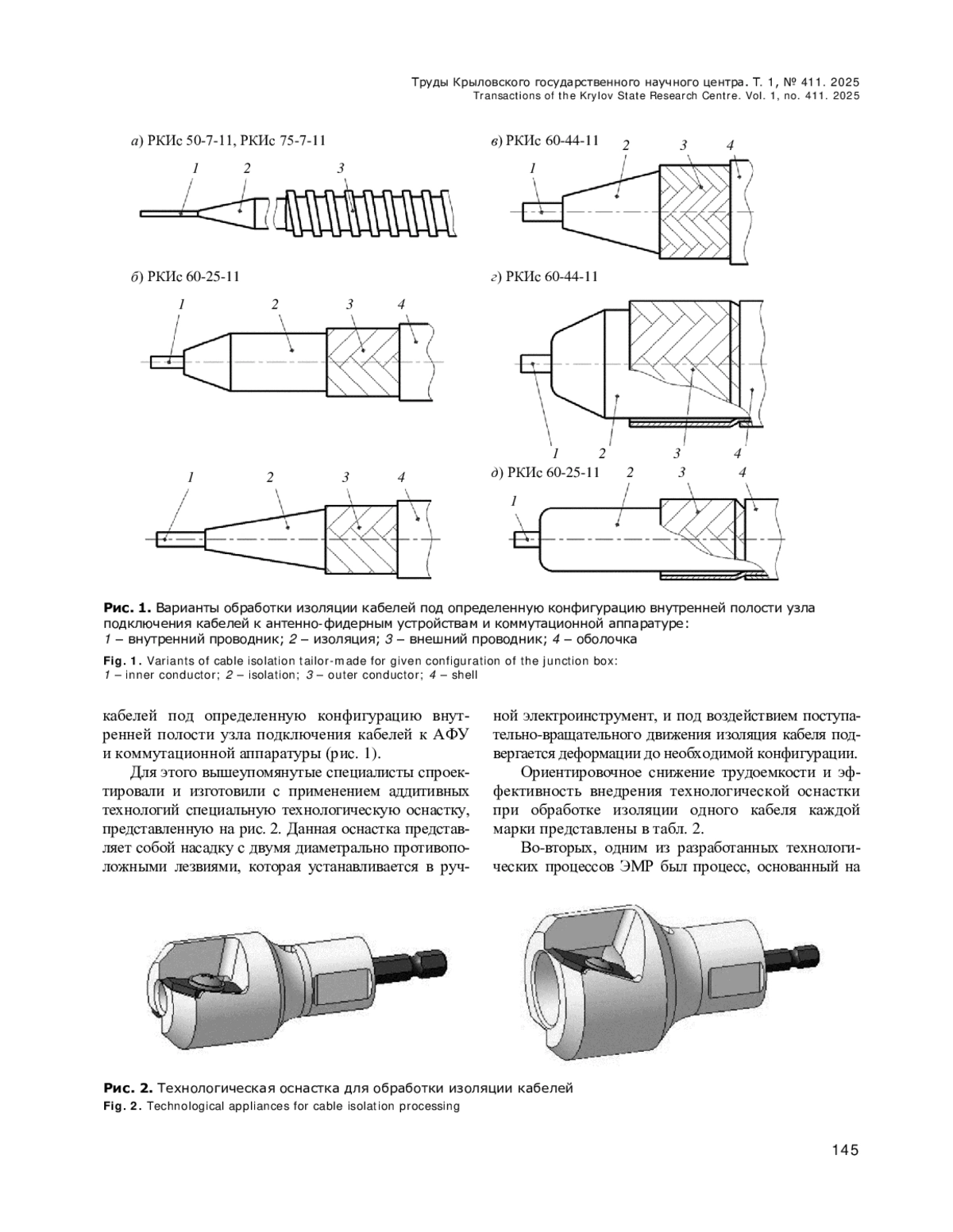 Материалы и методы. Проведены мероприятия по оптимизации и снижению трудоемкости технологических процессов ЭМР. Улучшения достигнуты за счет внедрения принципов механизации в процессы обработки изоляции кабелей под определенную конфигурацию внутренней полости узла подключения кабелей к антенно-фидерным устройствам (АФУ) и коммутационной аппаратуры. В связи с применением новых материалов в конструкции перспективных кабелей проведена оценка адгезионной способности нового материала к резинотехническим изделиям (РТИ) и определен режим вулканизации.