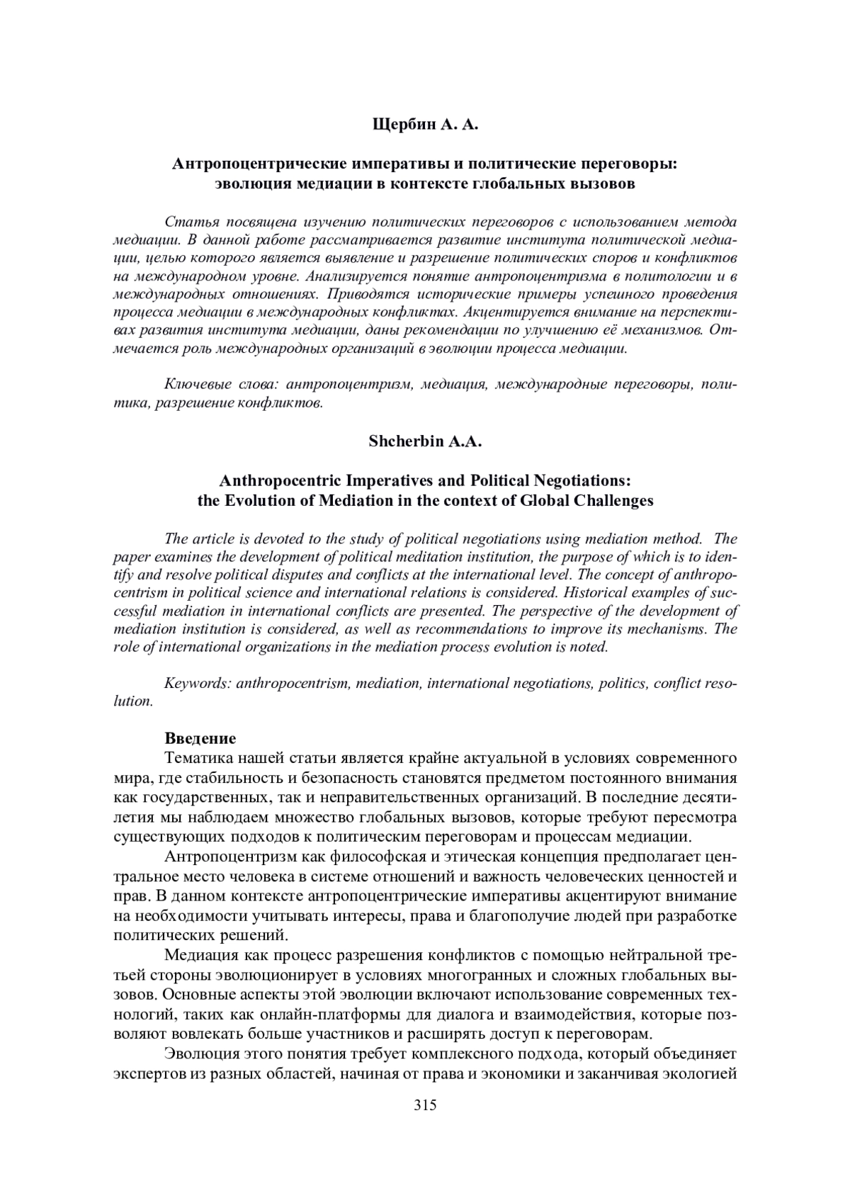 Статья посвящена изучению политических переговоров с использованием метода медиации. В данной работе рассматривается развитие института политической медиации, целью которого является выявление и разрешение политических споров и конфликтов на международном уровне. Анализируется понятие антропоцентризма в политологии и в международных отношениях. Приводятся исторические примеры успешного проведения процесса медиации в международных конфликтах. Акцентируется внимание на перспективах развития института медиации, даны рекомендации по улучшению её механизмов. Отмечается роль международных организаций в эволюции процесса медиации.