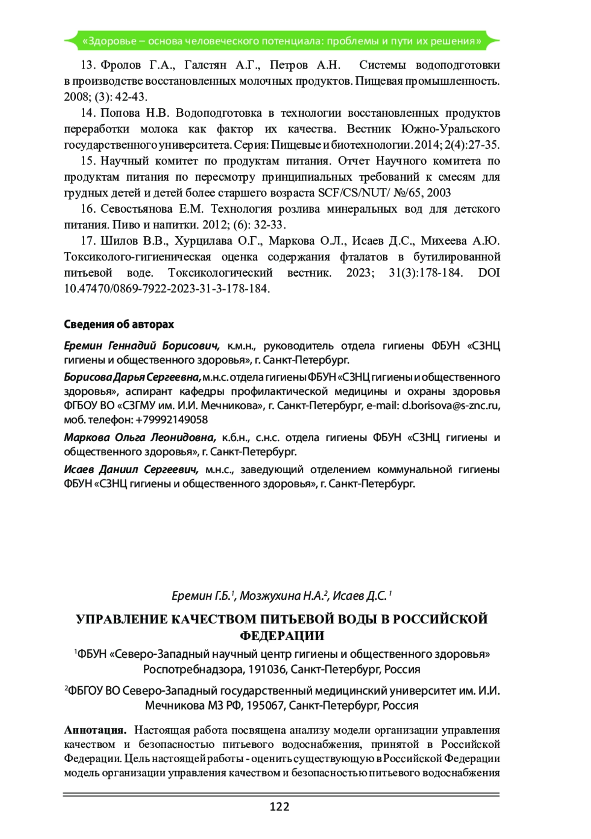 13. Исаев Д.С., Мозжухина Н.А., Еремин Г.Б., Грибова К.А. О применении оценки риска при обосновании временных отступлений качества питьевой воды // Актуальные вопросы гигиены: Электронный сборник научных трудов VIII Всероссийской научно- практической конференции с международным участием, посвященная 75-летию з.д.н. РФ, академика РАЕН, д.м.н., профессора В.В. Семеновой, Санкт-Петербург, 25 февраля 2023 года / ФГБОУ ВО СЗГМУ им И.И. Мечникова. - Санкт-Петербург: ФГБОУ ВО СЗГМУ им И.И. Мечникова, 2023. - С. 65-74. EDN: EHYWDD