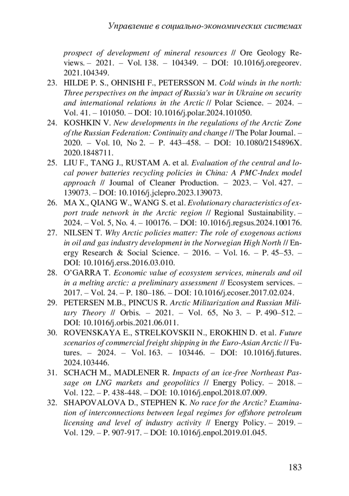 23. HILDE P. S., OHNISHI F., PETERSSON M. Cold winds in the north: Three perspectives on the impact of Russia’s war in Ukraine on security and international relations in the Arctic // Polar Science. – 2024. – Vol. 41. – 101050. – DOI: 10.1016/j.polar.2024.101050.