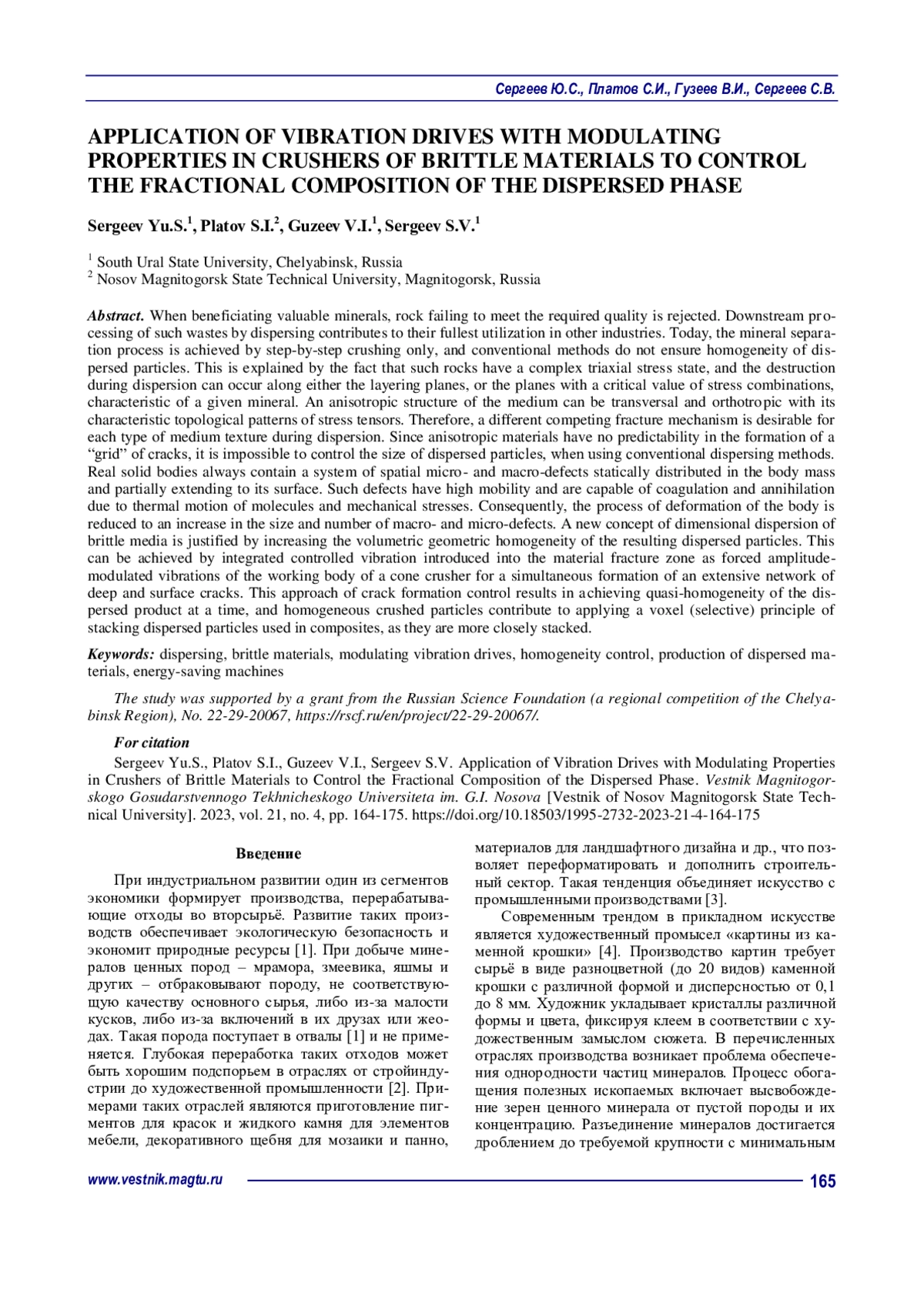 При обогащении ценных минералов отбраковывают породу, не соответствующую требуемому качеству. Глубокая переработка таких отходов диспергированием позволит наиболее полно их использовать в других отраслях. На сегодня процесс разъединения минералов достигается только поэтапным дроблением, а традиционные способы не обеспечивают однородность дисперсных частиц. Это объясняется тем, что у таких пород сложное трехосное напряженное состояние, а разрушение при диспергировании может происходить либо по плоскостям напластования, либо по плоскостям с критическим значением комбинаций напряжений, характерных для данного минерала. Анизотропная структура среды может быть трансверсальной и ортотропной со своими характерными топологическими картинами тензоров напряжений. Поэтому при диспергировании для каждого вида текстуры среды желателен свой конкурирующий механизм разрушения. А поскольку у анизотропных материалов нет предсказуемости в формировании «сетки» трещин, то при использовании традиционных методов диспергирования невозможно управлять размером дисперсных частиц. В реальном твердом теле всегда существует система пространственных микро- и макродефектов, статически распределенных в массиве тела и частично выходящих на его поверхность. Такие дефекты обладают высокой подвижностью и способны к коагуляции и аннигиляции из-за теплового движения молекул и механических напряжений. Следовательно, процесс деформации тела сводится к увеличению размеров и количества макро- и микродефектов. Новая концепция размерного диспергирования хрупких сред обоснована повышением объемной геометрической однородности получаемых дисперсных частиц. Это можно достигнуть путем введения в зону разрушения материала комплексного управляемого вибрационного воздействия в виде принудительных амплитудно-модулируемых колебаний рабочего органа конусной дробилки для одновременного формирования разветвленной сети глубоких и поверхностных трещин. Такой подход управления трещинообразованием позволит единовременно добиваться квазиоднородности дисперсного продукта, а однородная крошка способствует реализации воксельного (селективного) принципа укладки дисперсных частиц, применяемых в композитах, так как они теснее укладываются.