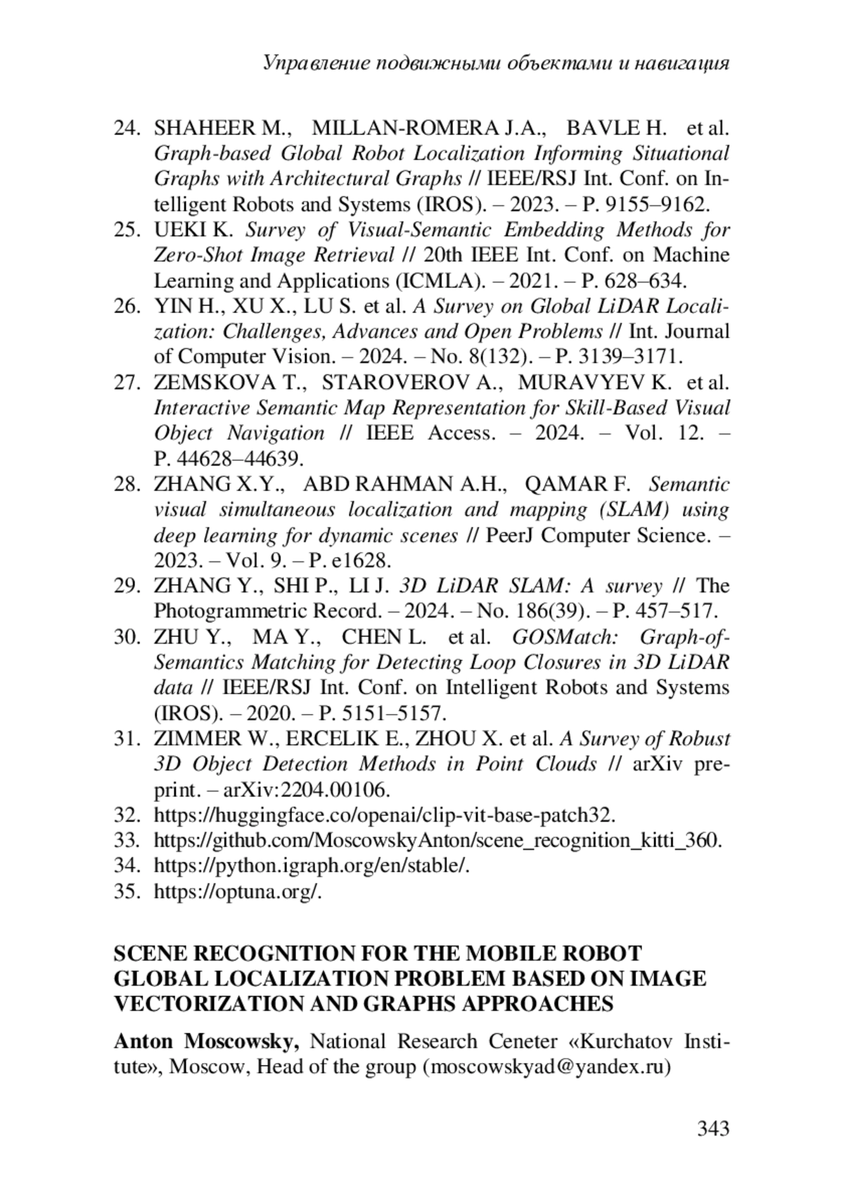 2. МОСКОВСКИЙ А.Д. Распознавание сцен для задачи гло-бальной локализации робота // Труды 34-й Международной научно-технической конференции «Экстремальная робототехника». – 2023. – C. 267–274.