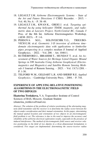 17. KARSHAKOV E.V., TRETYAKOVA Е.A., KAPLUN D.V. Analysis of the self-interference model and compensation meth-ods in airborne electromagnetics // Short abstracts of the 8th Workshop on Airborne Electromagnetics (AEM 2023, Fitzroy Island). Fitzroy Island: Australian Society of Exploration Geo-physicists. – 2023. – Vol. 2023 (2). – P. 97–100 (1–4).