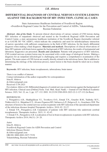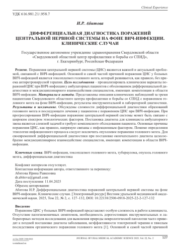 Поражения центральной нервной системы (ЦНС) являются важной и актуальной проблемой, связанной с ВИЧ-инфекцией. Основной и самой частой причиной поражения ЦНС у больных ВИЧ-инфекцией является токсоплазмоз головного мозга, который развивается, как правило, без приема антиретровирусной терапии. Цель исследования – проанализировать клинические варианты поражений ЦНС при ВИЧ-инфекции у амбулаторных пациентов с обоснованием дифференциальной диагностики и междисциплинарного взаимодействия специалистов, имеющих компетенции в области ВИЧ-инфекции. Материалы и методы. Представлены описания клинических наблюдений за тремя пациентами Свердловского областного центра профилактики и борьбы со СПИД с поражением головного мозга на фоне ВИЧ-инфекции, результаты инструментальной и лабораторной диагностики. Результаты и заключение. Обсуждены сложности дифференциальной диагностики образований головного мозга и последующего лечения у пациентов с поражением ЦНС при ВИЧ-инфекции. При прогрессировании ВИЧ-инфекции поражение центральной нервной системы может быть связано с широким спектром этиологических факторов. Постановка диагноза для клинициста амбулаторного звена является сложной задачей и требует комплексного обследования пациента. Основные причины поражения ЦНС, как правило, напрямую связаны с инфекционным фактором. Помимо определения этиологии инфекционного процесса следует исключить опухолевое поражение головного мозга. Для своевременной дифференциальной диагностики при постановке окончательного диагноза целесообразно междисциплинарное взаимодействие специалистов, имеющих компетенции в области ВИЧинфекции.