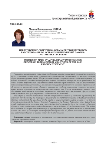 Вопросам исследования и повышения эффективности процессуальной профилактической деятельности сотрудников органов предварительного расследования уделяется достаточно большое внимание, однако чаще всего научная дискуссия и интерес юристов-практиков сосредоточены на проблемах нормативной регламентации и организации деятельности, связанной с внесением представлений об устранении обстоятельств, способствовавших совершению преступлений. Тем не менее в ч. 2 ст. 158 УПК РФ предусмотрена возможность внесения дознавателем, следователем и руководителем следственного органа представления об устранении нарушений закона. При этом подобное представление в различного рода публикациях зачастую упоминается лишь в аспекте простой констатации его существования [2-4; 6; 9; 10]. Ю. А. Матвейчевым анализировались отдельные аспекты внесения сотрудниками органов уголовного преследования представлений об устранении нарушений закона в соответствии с законодательством Республики Беларусь [8, с. 76-77].