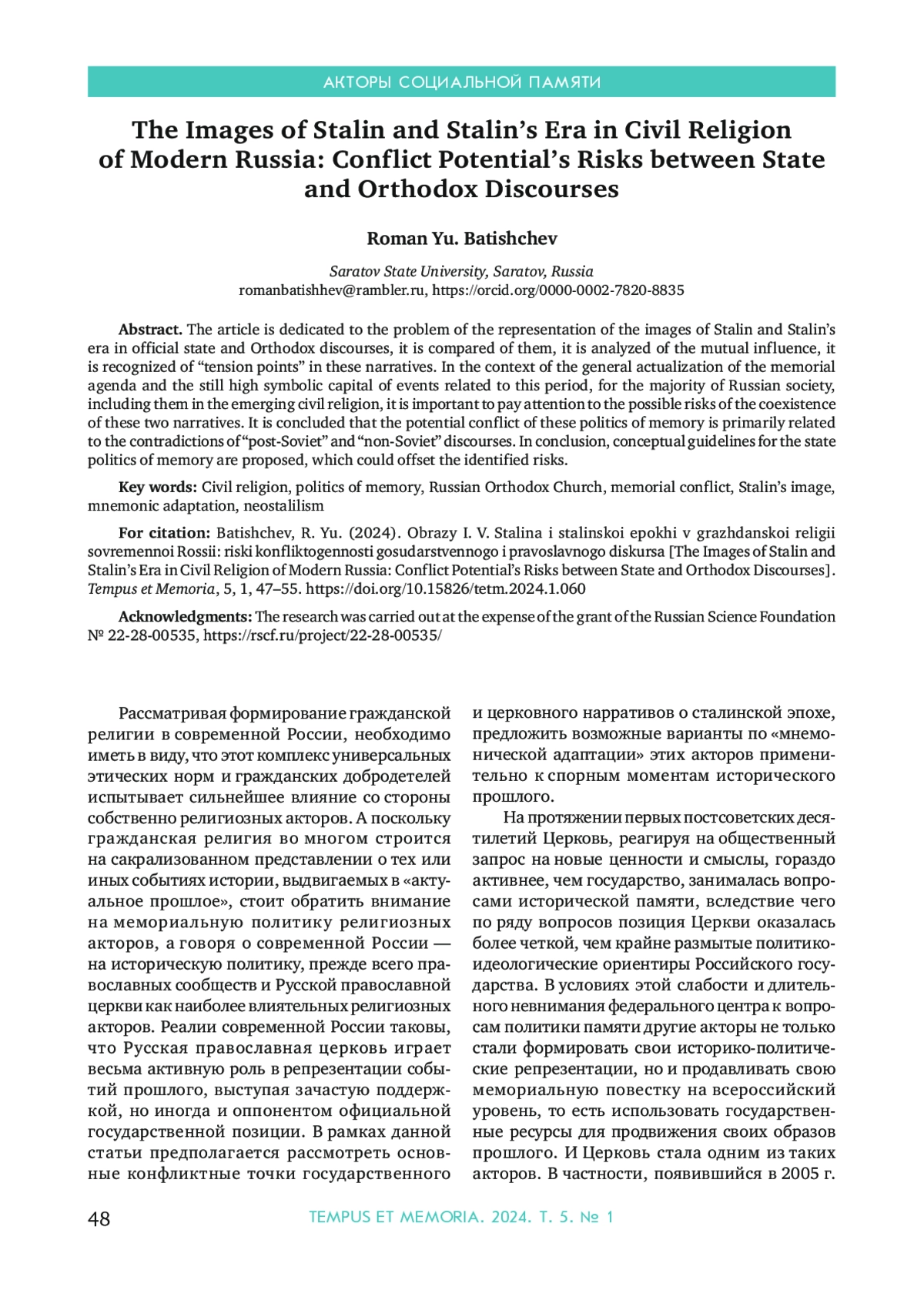 В статье рассматривается проблема репрезентации образов И. В. Сталина и сталинской эпохи в официальном государственном и православном дискурсах, проводится их сравнение, оценка степени взаимовлияния друг на друга, выявляются основные точки «напряженности» в этих нарративах. В условиях общей актуализации мемориальной повестки и по-прежнему высокого символического капитала событий, связанных с этим периодом, для большей части российского общества, включения их в формируемую гражданскую религию важно обратить внимание на возможные риски сосуществования этих двух нарративов. Делается вывод, что потенциальная конфликтность этих политик памяти связана прежде всего с противоречиями «постсоветских» и «несоветских» дискурсов. В заключение предлагаются концептуальные установки для государственной политики памяти, которые могли бы нивелировать выявленные риски.
