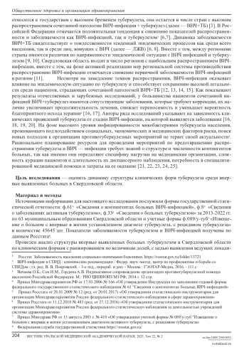 Несмотря за замедление темпов распространения, ВИЧ-инфекция оказывает влияние на эпидемическую ситуацию по туберкулезу. Свердловская область входит в число регионов с наибольшим распространением ВИЧ-инфекции. Цель исследования — оценить динамику структуры клинических форм туберкулеза среди впервые выявленных больных в Свердловской области. Материалы и методы: Источниками информации служили формы государственной статистической отчетности. Проведен анализ структуры клинических форм туберкулеза среди впервые выявленных больных в динамике за период 2014-2023 гг. Рассчитан коэффициент корреляции Пирсона между долей впервые выявленных больных туберкулезом в сочетании с ВИЧ и долей впервые выявленных больных туберкулезом с определенной клинической формой заболевания, статистически достоверным считался коэффициент при p<0,05. Результаты. В 2023 году заболеваемость туберкулезом снизилась на 52,2% к уровню 2013 года. На фоне изменения размера доли больных ВИЧ-инфекцией в сочетании с туберкулёзом отмечаются изменения в структуре клинических форм туберкулеза у впервые выявленных больных. Установлена прямая высокой силы статистически достоверная корреляционная связь между динамикой доли больных ВИЧ-инфекцией в сочетании с туберкулёзом и долей туберкулеза внутригрудных лимфатических узлов (r=0,86; p<0,05), диссеминированного туберкулеза (r=0,76; p<0,05), отрицательная корреляция по отношению к долям очагового (r= -0,39; p<0,05), инфильтративного туберкулеза (r= -0,91; p<0,05), цирротического туберкулеза (r= -0,72; p<0,05) и туберкулезного плеврита (r= -0,78; p<0,05). Заключение. Увеличение доли больных туберкулезом в сочетании с ВИЧ-инфекцией оказывает значимое влияние на структуру клинических форм туберкулеза в виде увеличения долей клинических форм заболевания, характерных для поздних стадий ВИЧ-инфекции с одновременным снижением долей и ранговых позиций клинических форм, характерных для пациентов без выраженного иммунодефицита.
