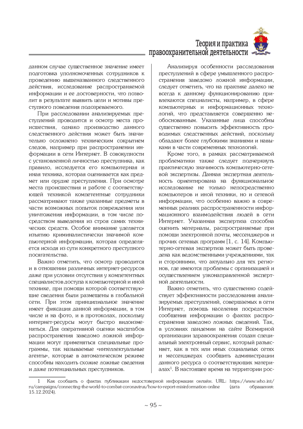 2. Канунникова, Н.Г. К вопросу об обстоятельствах, подлежащих установлению при расследовании преступлений в сфере умышленного распространения заведомо ложной информации в СМИ и информационно-телекоммуникационных сетях / Н.Г. Канунникова // Право и управление. - 2023. - N 11. - С. 320-325.
