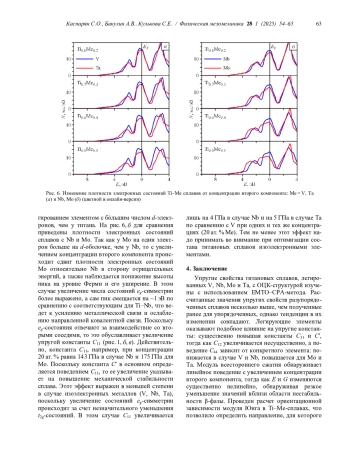 Упругие свойства ряда бинарных сплавов титана Ti-Ме (Ме = V, Nb, Mo, Ta) c объемно-центрированной структурой расчетов с использованием методов точных МТ-орбиталей в приближении когерентной способности. Показано, что константы упругости C 11 и C 12 увеличиваются с концентрацией второго компонента в сплавах β-Ti-Me, хотя последняя слабо зависит от содержания, тогда как C 44 снижается в V и Nb, но это предусмотрено для Мо и Та. Расчет плотностей электронного течения показал, что концентрационное поведение C 11 обусловлено своеобразными химическими связями со следующими соседями, что наиболее выражено при увеличении числа d-электронов данного элемента. Установлено, что для всех изученных бинарных сплавов наименьшие значения модуля Юнга могут быть обнаружены вблизи области нестабильности β-фазы, а также в направлении <100>. С ростом содержания тантала анизотропия модуля Юнга уменьшается, но тогда ее характер сохраняется, как сплавы с V, Nb и Mo, при некоторых основах второго компонента становятся практически изотропными и меняется характер анизотропии. В результате полученные характеристики упругости бинарных титановых сплавов находятся в хороших согласованиях с учетом экспериментальных и теоретических данных.