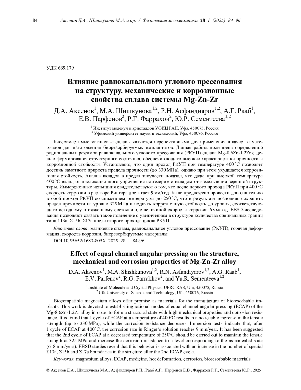 27. Aksenov, D.A., Nazarov, A.A., Raab, G.I., Raab, A.G., Fakhretdinova, E.I., Asfandiyarov, R.N., Shishkunova, M.A., and Sementeeva, Y.R., Effects of Severe Plastic Deformation and Ultrasonic Treatment on the Structure, Strength, and Corrosion Resistance of Mg-Al-Zn Alloy, Materials, 2022, vol. 15(20), p. 7200. DOI: 10.3390/ma15207200