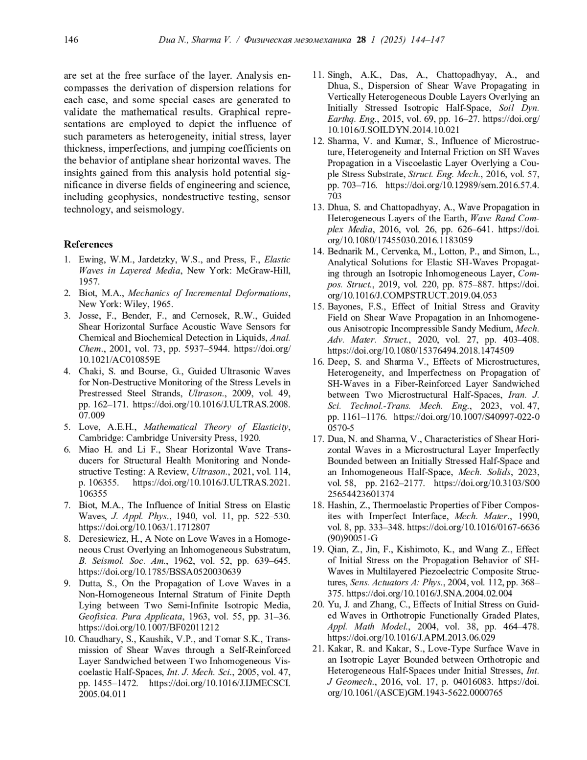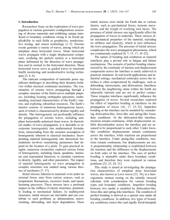 17. Dua, N. and Sharma, V., Characteristics of Shear Horizontal Waves in a Microstructural Layer Imperfectly Bounded between an Initially Stressed Half-Space and an Inhomogeneous Half-Space, Mech. Solids, 2023, vol. 58, pp. 2162-2177. DOI: 10.3103/S0025654423601374
