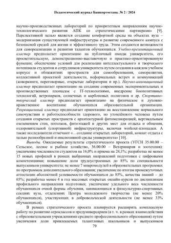 Основные направления подготовки кадров аграрного профиля сосредоточены в двух укрупненных группах: 35.00.00 Сельское, лесное и рыбное хозяйство, 36.00.00 Ветеринария и зоотехния. Однако наблюдается отсутствие проактивной модернизации содержания АгроБиоТех-образования с формированием цифровых компетенций, учетом научно-технического прогнозирования и макротенденциями развития АПК. В статье разработаны новые методы в образовательной политике с формированием цифровых компетенций в области использования пакетов зеленой агробиотехнологии, генетики и селекции животноводства, которые будут внедрены в аграрные вузы страны. Предложена реализация на «цифровых кафедрах» не менее 7 микромодулей по цифровым компетенциям в образовательные программы по программам дополнительного образования для обучающихся. Представлена концепция единой образовательной программы, которая включает внедрение образовательного трека «школа (агроклассы) – СПО – вуз – агропредприятия» и индивидуализацию обучения с выбором профиля подготовки после второго курса, включая дополнительную квалификацию. Новая модель позволит освоить академический трек или академический и исследовательский треки на уровне бакалавриата, после окончания бакалавриата выбрать экспериментальный трек и научно-исследовательский трек магистратуры и аспирантуры, что увеличит вовлеченность обучающихся в исследовательскую и проектную деятельность по научным фронтирам. Приведена модернизация развития академической среды через разработку модели ускоренной подготовки специалистов в агропромышленной сфере на «цифровой кафедре» посредством получения дополнительной квалификации по ИТ-профилю. В Республике Башкортостан 38% населения живет на селе, сельское хозяйство – лидер в России по ряду позиций. Модернизация системы АгроБиоТех-образования позволит подготовить высококвалифицированных специалистов для поддержания передовых позиции по производству продукции АПК. Материалы, представленные в статье, получены в рамках реализации стратегического проекта «Трансформация агрообразования с формированием цифровых компетенций и активной гражданской позиции обучающихся» ФГБОУ ВО Башкирский ГАУ по программе стратегического академического лидерства «Приоритет-2030».