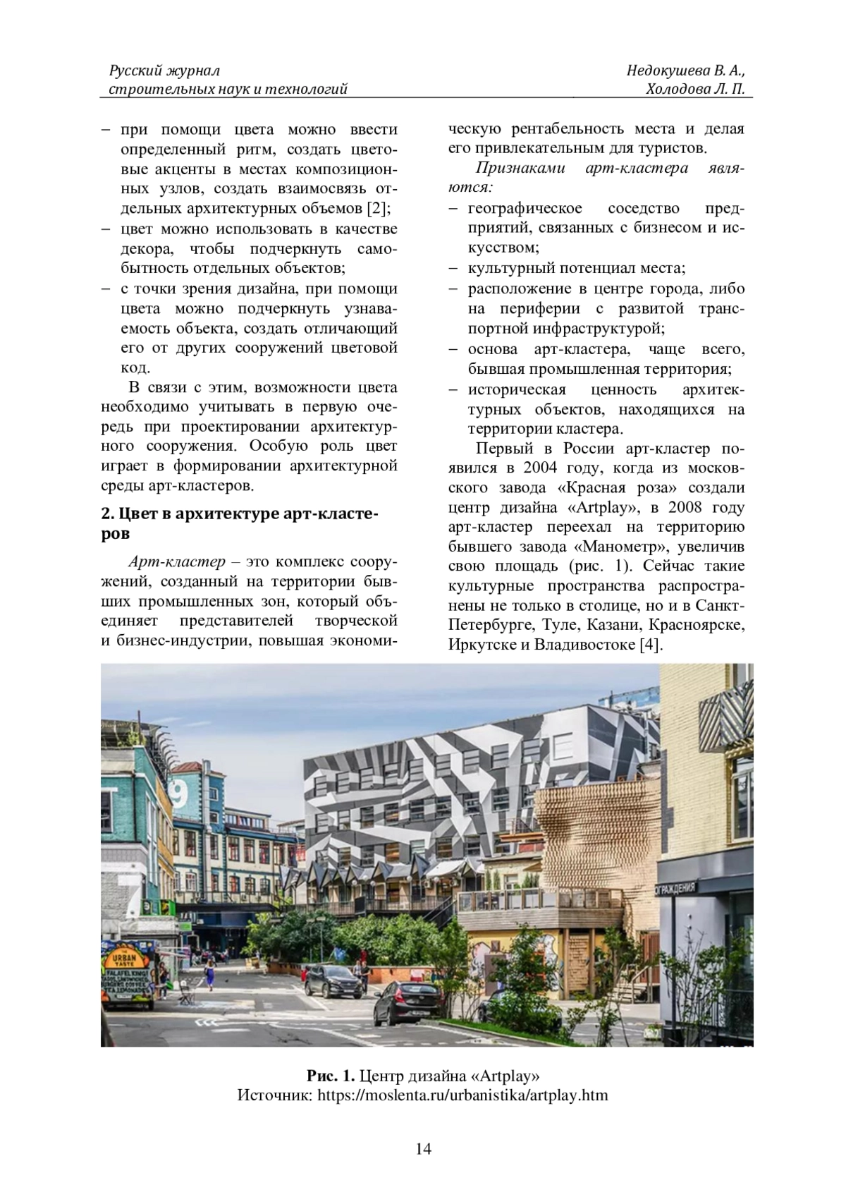 НЕДОКУШЕВА В. А., ХОЛОДОВА Л. П. ЦВЕТ В АРХИТЕКТУРЕ АРТ-КЛАСТЕРОВ // RUSSIAN JOURNAL OF CONSTRUCTION SCIENCE AND TECHNOLOGY. 2023. Т. 9 № 1