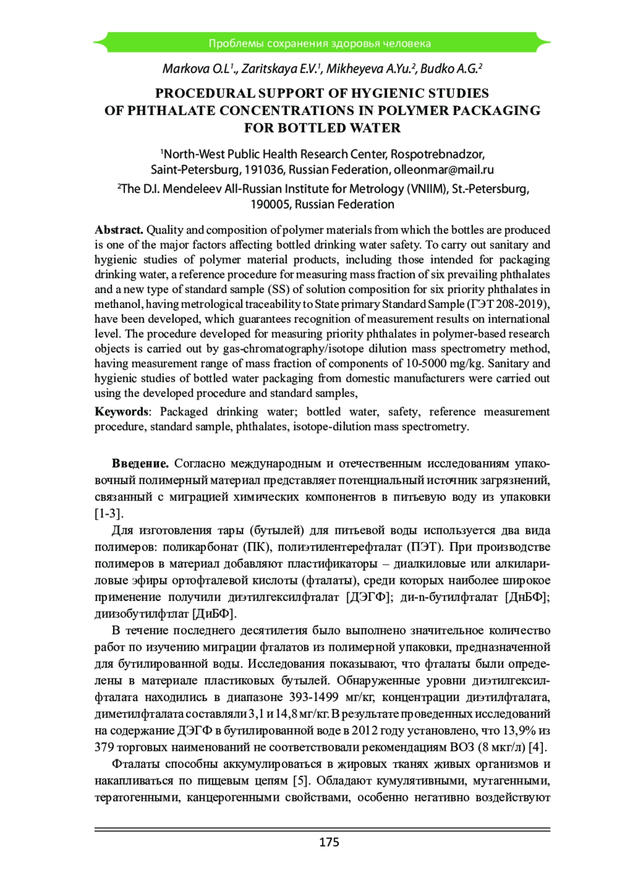 Одним из ведущих факторов, влияющих на безвредность упакованной питьевой воды, является качество и состав полимерных материалов, из которых изготовлены бутыли. Для проведения санитарно-гигиенических исследований изделий из полимерных материалов, в том числе предназначенных для упаковывания питьевой воды, разработаны референтная методика измерений массовой доли шести приоритетных фталатов и новый тип стандартного образца (СО) состава раствора шести приоритетных фталатов в метаноле, обеспеченного метрологической прослеживаемостью к ГЭТ 208-2019, что гарантирует признание результатов измерений на международном уровне. Разработанный метод измерений приоритетных фталатов в объектах исследования на основе полимеров осуществляется с использованием газовой хроматографии/масс-спектрометрии с изотопным разбавлением с диапазоном измерений массовой доли компонентов 10-5000 мг/кг. С применением разработанного метода и стандартных образцов были проведены санитарно-гигиенические исследования упаковки бутилированной воды отечественных производителей.
