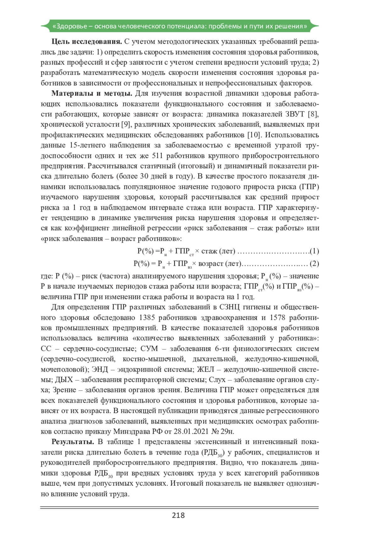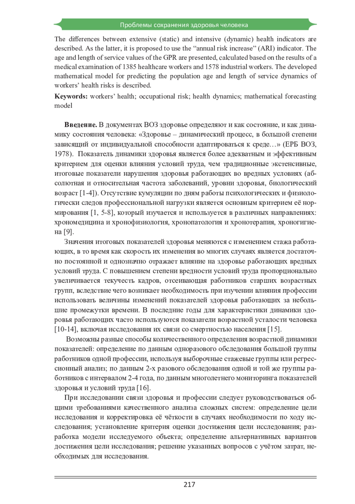 Рассматриваются методологические вопросы изучения возрастной и стажевой динамики состояния здоровья работающих. Решались две задачи: определение скорости изменения состояния здоровья работников разных профессий и разработка ее математической модели в зависимости от профессиональных и непрофессиональных факторов. Отмечены различия использования экстенсивных и интенсивных показателей здоровья, в качестве последних предлагается показатель годового прироста риска (ГПР). Возрастные и стажевые значения ГПР рассчитаны по результатам медицинского обследования 2963 работников промышленных предприятий и здравоохранения. Описывается разработанная математическая модель прогнозирования популяционной возрастной и стажевой динамики риска здоровью работников.