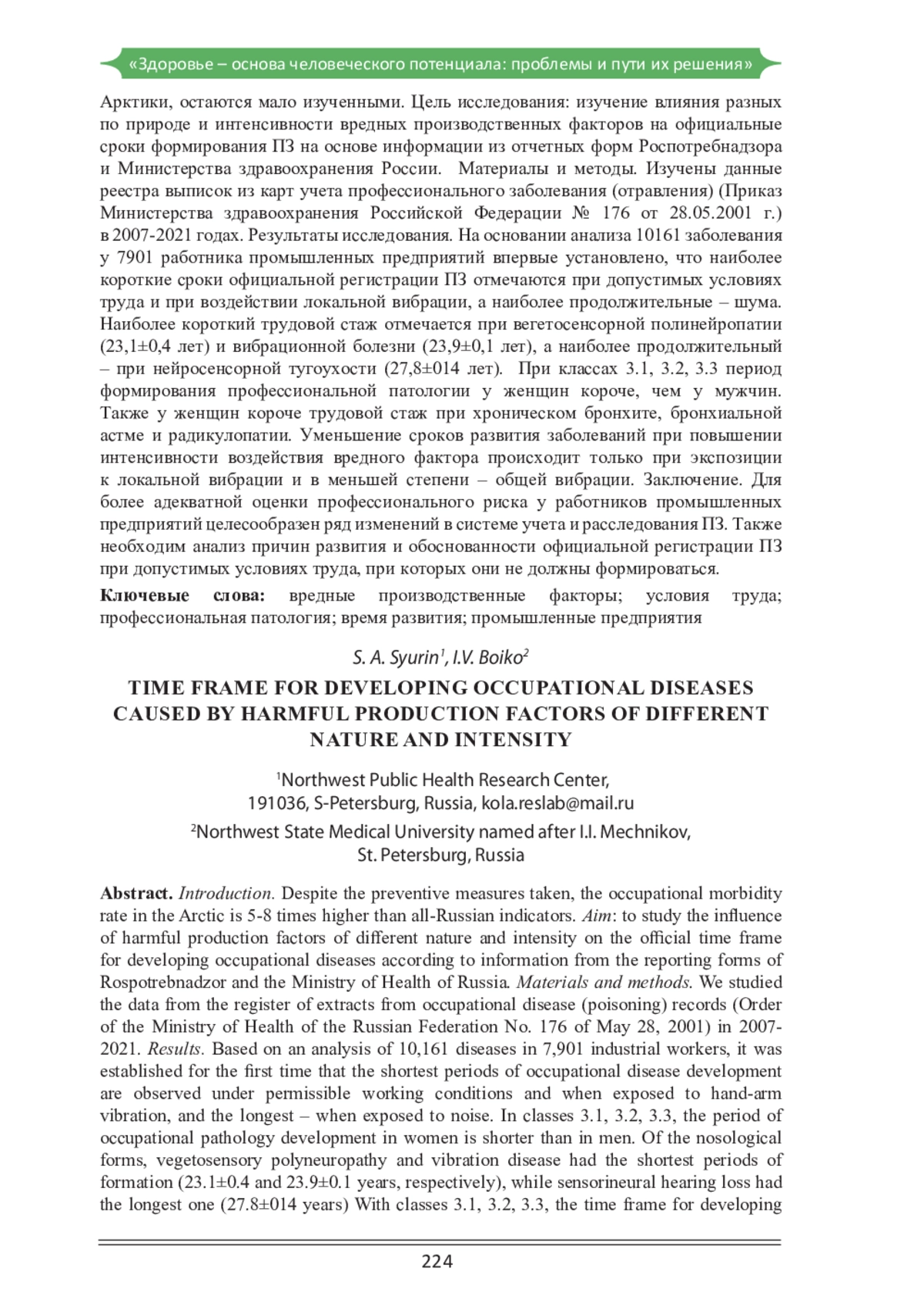 Введение. Несмотря на активно проводимые исследования, многие аспекты возникновения и развития профессиональных заболеваний (ПЗ), в том числе в условиях Арктики, остаются мало изученными.