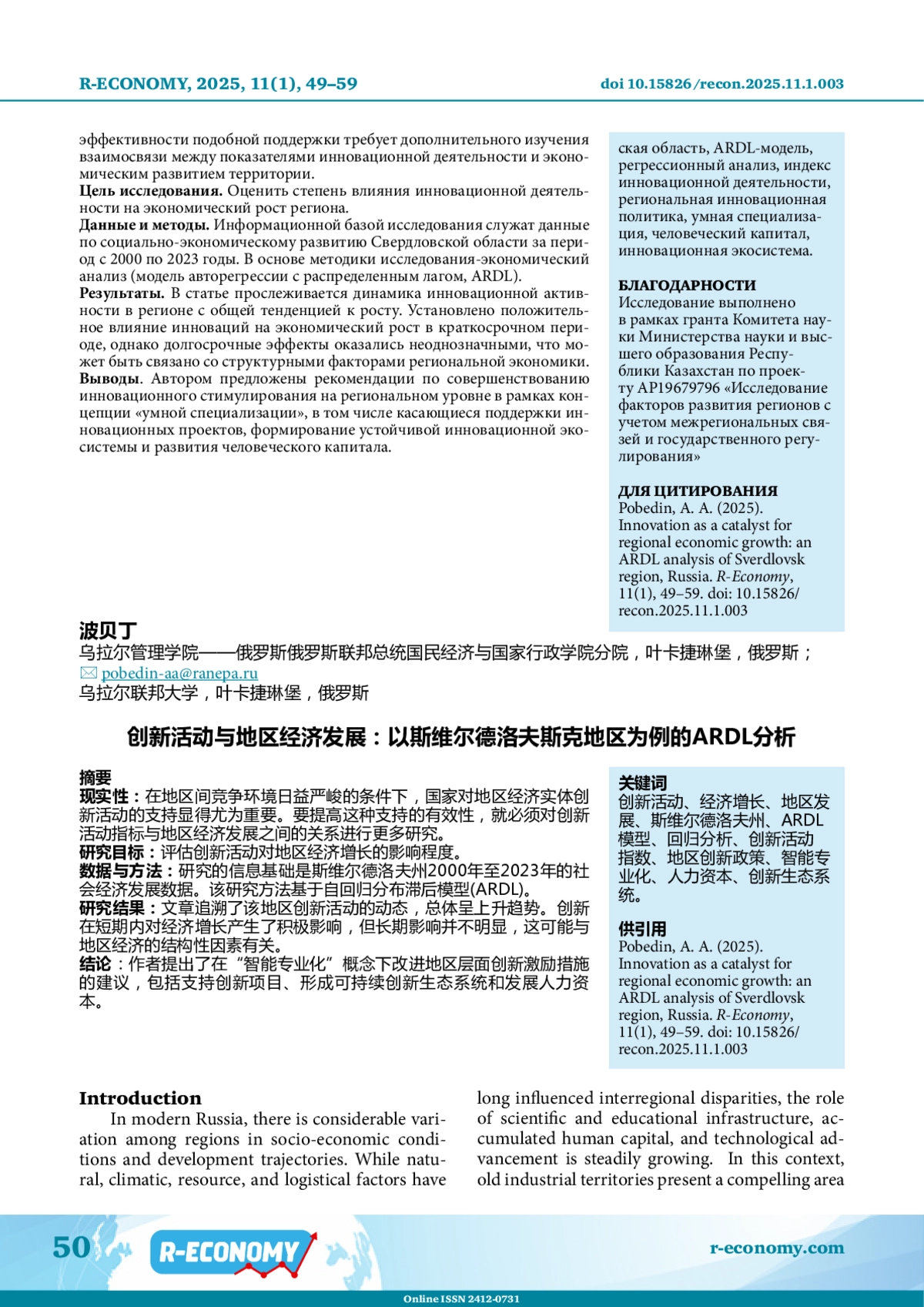 Relevance. As interregional competition intensifies, state support for innovation in regional economies becomes increasingly important. To improve the effectiveness of such support, it is necessary to gain a better understanding of the link between innovation and economic development. Research Objective. The study aims to assess the impact of innovation activity on regional economic growth, focusing on the case of a large industrial region in Russia. Data and Methods. The analysis uses socio-economic data for Sverdlovsk region from 2000 to 2023 and applies an autoregressive distributed lag (ARDL) model to assess the relationship between innovation and economic performance. The study introduces an Innovation Activity Index, which incorporates several key components, such as the number of research personnel, internal R&D expenditures, and other relevant indicators, for a more comprehensive evaluation. Results. The study traces the region’s innovation activity, revealing a general upward trend. However, while innovation clearly has a positively influence on economic growth in the short term, its effects over medium- and long-term periods are less obvious, likely due to structural factors in the regional economy. Conclusion. The study proposes recommendations to enhance regional innovation support within the «smart specialization» framework, including backing innovation projects, developing a sustainable innovation ecosystem, and investing in human capital.