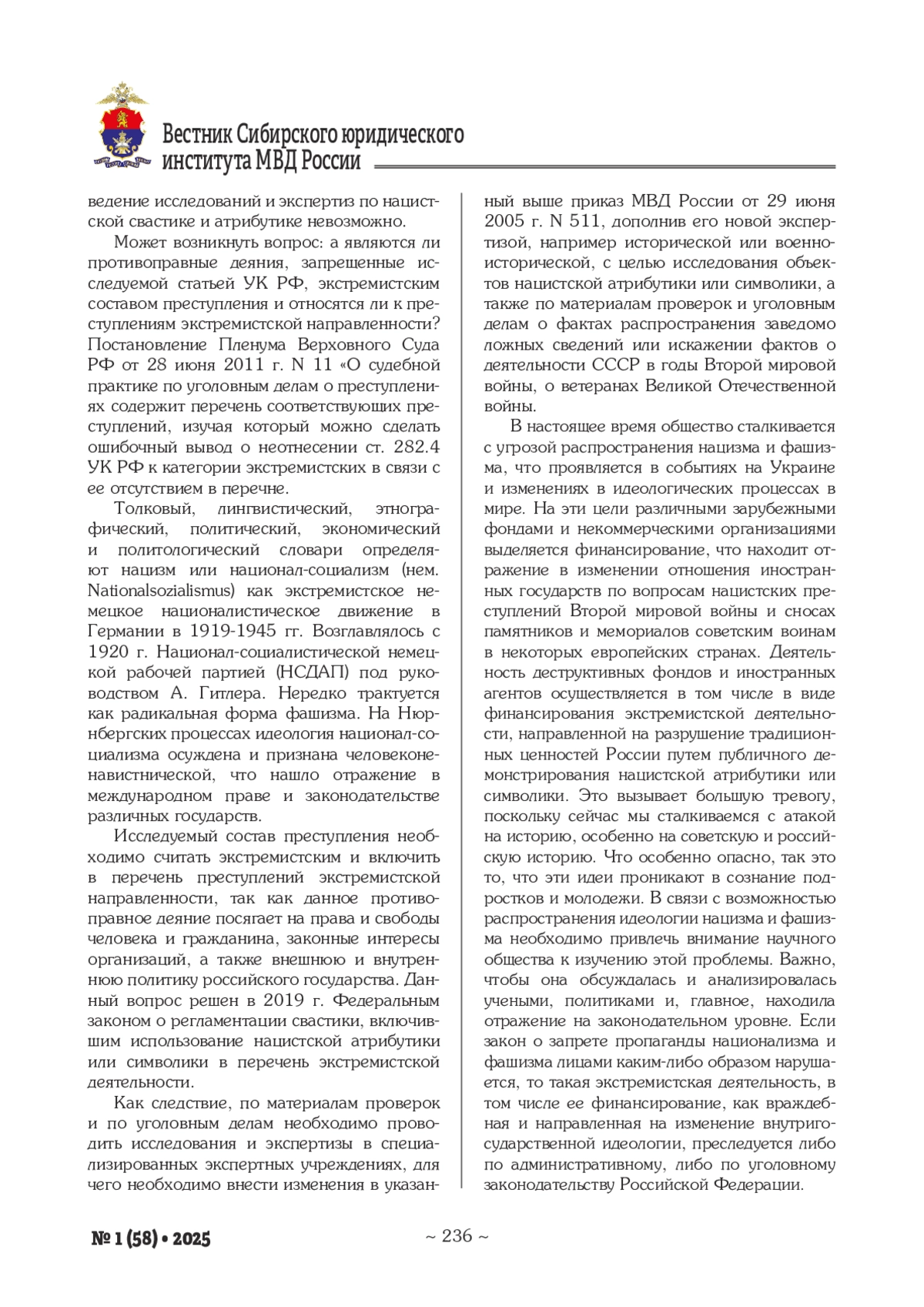 В статье исследуется изменение российского законодательства по противодействию экстремистским проявлениям, предусматривающее ответственность за публичное демонстрирование нацистской атрибутики или символики. Одной из возможных причин изменения законодательства Российской Федерации, регламентирующего ответственность за публичное демонстрирование нацистской атрибутики или символики, рассматривается ответная реакция на деятельность зарубежных стран, направленную на декриминализацию военных преступлений нацистской Германии во время Великой Отечественной войны.