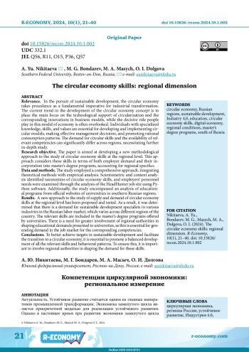 Relevance. In the pursuit of sustainable development, the circular economy takes precedence as a fundamental imperative for industrial transformation. The current trend in the development of the circular economy concept is to place the main focus on the technological support of circularization and the corresponding innovations in business models, while the decisive role people play in this model of economy is often overlooked. Individuals with specialized knowledge, skills, and values are essential for developing and implementing circular models, making effective management decisions, and promoting rational consumption patterns. The demand for circular skills and the availability of relevant competencies can significantly differ across regions, necessitating further in-depth study. Research objective. The paper is aimed at developing a new methodological approach to the study of circular economy skills at the regional level. This approach considers these skills in terms of both employer demand and their incorporation into master’s degree programs, accounting for regional specifics. Data and methods. The study employed a comprehensive approach, integrating theoretical methods with empirical analysis. Scientometric and content analysis identified taxonomies of circular economy skills, and employers’ personnel needs were examined through the analysis of the HeadHunter job site using Python software. Additionally, the study encompassed an analysis of educational programs from official websites of universities in southern Russian regions. Results. A new approach to the study of supply and demand of circular economy skills at the regional level has been proposed and tested. As a result, it was determined that there is a demand for sustainable development specialists in various industries in the Russian labor market, which varies across different regions of the country. The relevant skills are included in the master’s degree programs offered by universities. There is a need for greater involvement of regional authorities in shaping educational demands presented to universities, as this is essential for generating demand in the job market for the corresponding competencies. Conclusions. To better achieve targets in sustainable development and facilitate the transition to a circular economy, it is essential to promote a balanced development of all the relevant skills and behavioral patterns. To ensure this, it is important to involve regional authorities in shaping the demand for these skills.