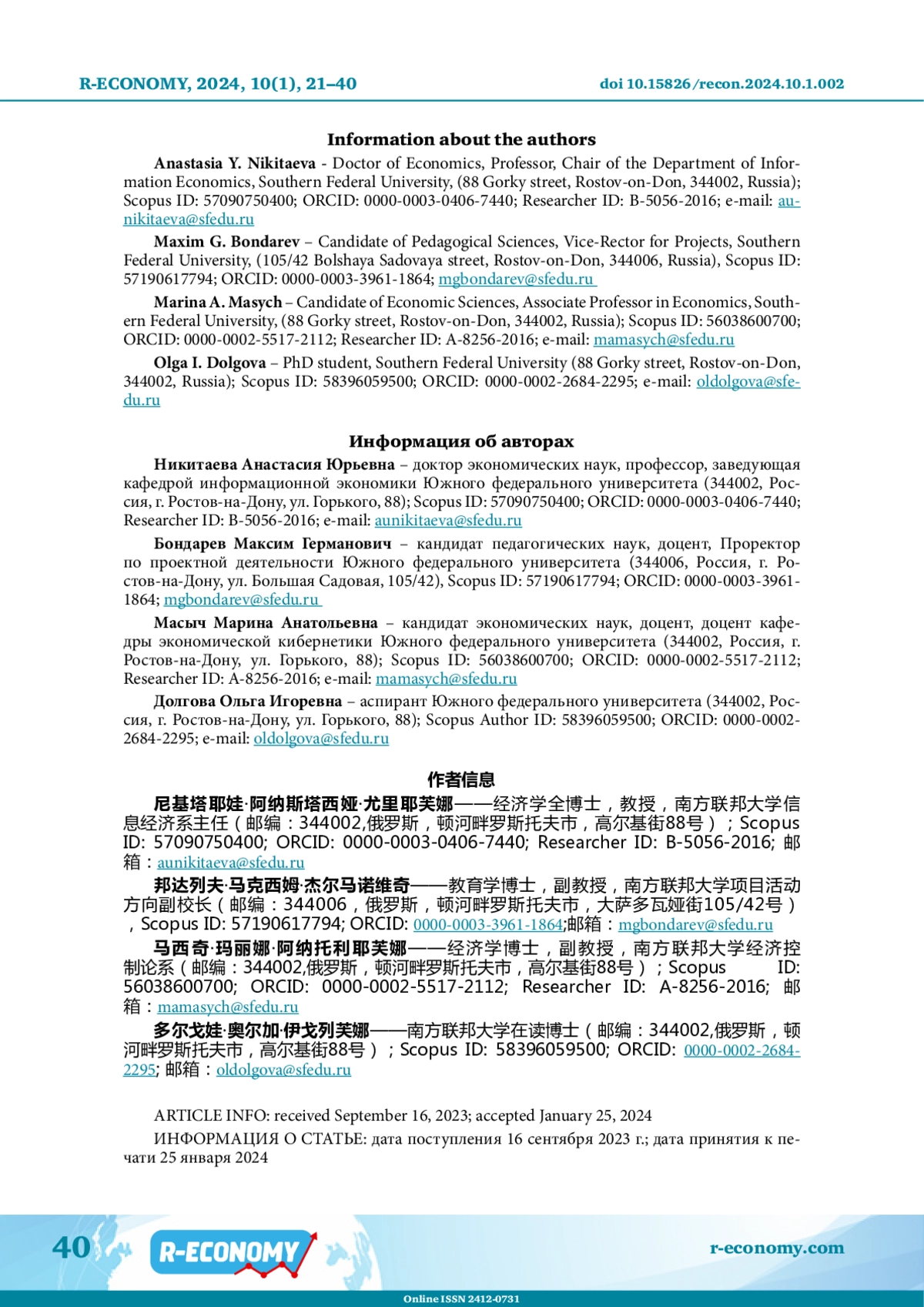 23. Masych M. A. (2019). The technologies of the intellectual resources application in the context of the necessity of labour productivity enhancement in the digital economy. Russian Journal of Innovation Economics, 9(4), pp. 1443-1458. DOI: 10.18334/vinec.9.4.41196 EDN: YTRTTG
