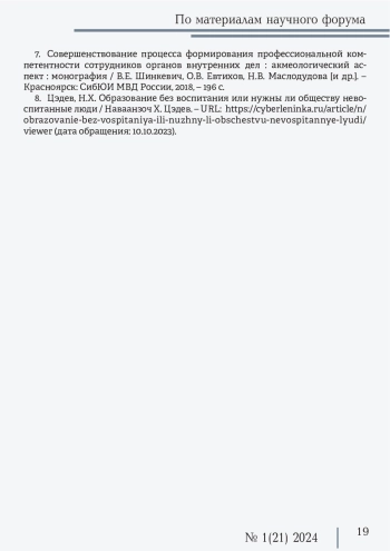 7. Совершенствование процесса формирования профессиональной компетентности сотрудников органов внутренних дел: акмеологический аспект: монография / В.Е. Шинкевич, О.В. Евтихов, Н.В. Маслодудова [и др.]. - Красноярск: СибЮИ МВД России, 2018, - 196 с. EDN: YWIZGH