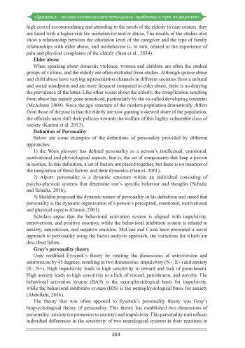 Пожилое население в настоящее время является одной из наиболее уязвимых групп общества, что является достаточно значимой и глобальной проблой. Всемирная организация здравоохранения сообщила, что численность пожилых людей растет благодаря увеличению продолжительности жизни и улучшению условий жизнедеятельности. Тем не менее, несмотря на рост численности пожилых людей, адекватные меры, направленные на удовлетворение их потребностей, далеки от желаемых. Поэтому обеспечение психологического и физического здоровья пожилых людей, как одного из наиболее уязвимых слоев общества, требует особого внимания. Неправильное обращение с пожилыми людьми является серьезной проблемой общественного здравоохранения во многих странах, которая стремительно актуализируется в последние два десятилетия. В связи с этим в данном исследовании ставится задача рассмотреть компоненты регуляции эмоций и личностные особенности, которые эффективны при жестоком обращении с пожилыми людьми.