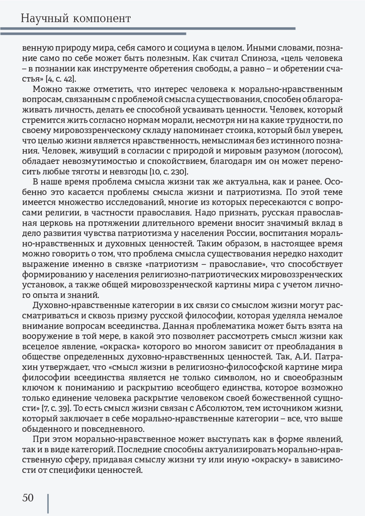 7. Патрахин А.И. Смысл и значение понятия жизнь в философии всеединства / А.И. Патрахин // Культура, наука, образование: проблемы и перспективы: материалы VII Всероссийской научно-практической конференции с международным участием, Нижневартовск, 12 ноября 2019 года / отв. ред. Д.А. Погонышев: в 2 т. Нижневартовск: Нижневартовский государственный университет, 2019. - Т. 2. EDN: DLJMVR