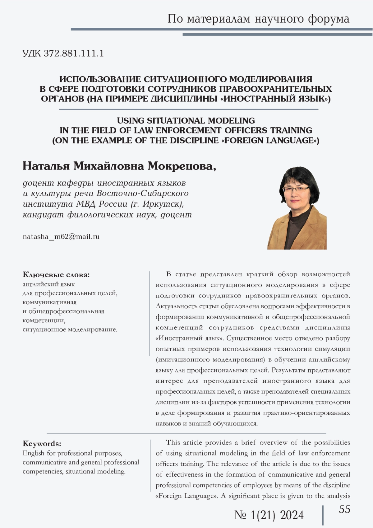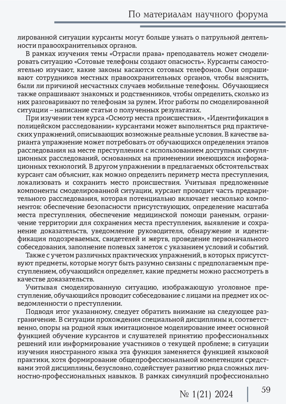 В статье представлен краткий обзор возможностей использования ситуационного моделирования в сфере подготовки сотрудников правоохранительных органов. Актуальность статьи обусловлена вопросами эффективности в формировании коммуникативной и общепрофессиональной компетенций сотрудников средствами дисциплины «Иностранный язык». Существенное место отведено разбору опытных примеров использования технологии симуляции (имитационного моделирования) в обучении английскому языку для профессиональных целей. Результаты представляют интерес для преподавателей иностранного языка для профессиональных целей, а также преподавателей специальных дисциплин из-за факторов успешности применения технологии в деле формирования и развития практико-ориентированных навыков и знаний обучающихся.