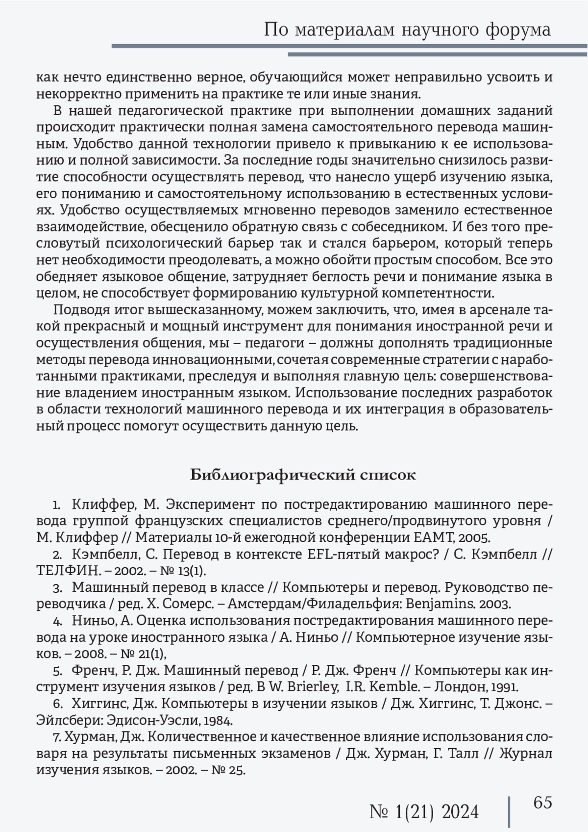 4. Ниньо, А. Оценка использования постредактирования машинного перевода на уроке иностранного языка / А. Ниньо // Компьютерное изучение языков. - 2008. - № 21(1).
