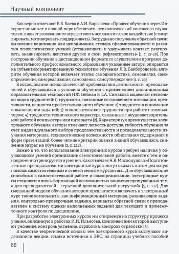 1. Баева, Е.В. Из опыта преподавания психологических дисциплин в условиях дистанционного образования (на примере образовательного процесса ВИПК МВД России) / Е.В. Баева, А.И. Барышева // Актуальные проблемы психологии правоохранительной деятельности: концепции, подходы, технологии (Васильевские чтения - 2022): материалы международной научно-практической конференции / под ред. Ю.А. Шаранова; сост. И.Ю. Кобозев, А.А. Сарсенова. - СПб., 2022. - С. 26-31. EDN: NCVSCS