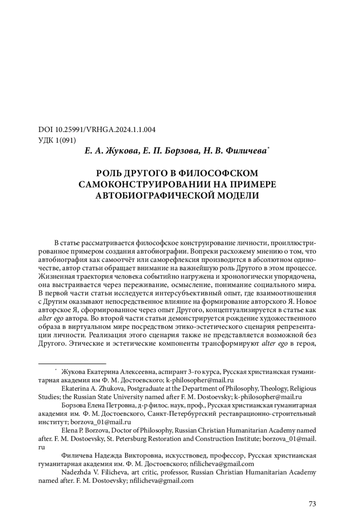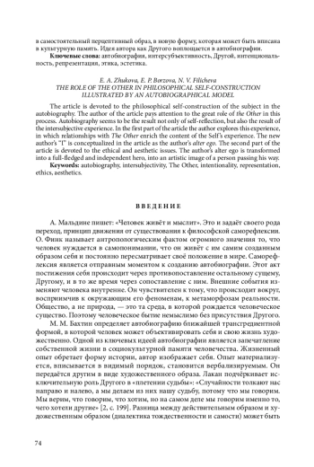 В статье рассматривается философское конструирование личности, проиллюстрированное примером создания автобиографии. Вопреки расхожему мнению о том, что автобиография как самоотчёт или саморефлексия производится в абсолютном одиночестве, автор статьи обращает внимание на важнейшую роль Другого в этом процессе. Жизненная траектория человека событийно нагружена и хронологически упорядочена, она выстраивается через переживание, осмысление, понимание социального мира. В первой части статьи исследуется интерсубъективный опыт, где взаимоотношения с Другим оказывают непосредственное влияние на формирование авторского Я. Новое авторское Я, сформированное через опыт Другого, концептуализируется в статье как alter ego автора. Во второй части статьи демонстрируется рождение художественного образа в виртуальном мире посредством этико-эстетического сценария репрезентации личности. Реализация этого сценария также не представляется возможной без Другого. Этические и эстетические компоненты трансформируют alter ego в героя, в самостоятельный перцептивный образ, в новую форму, которая может быть вписана в культурную память. Идея автора как Другого воплощается в автобиографии.