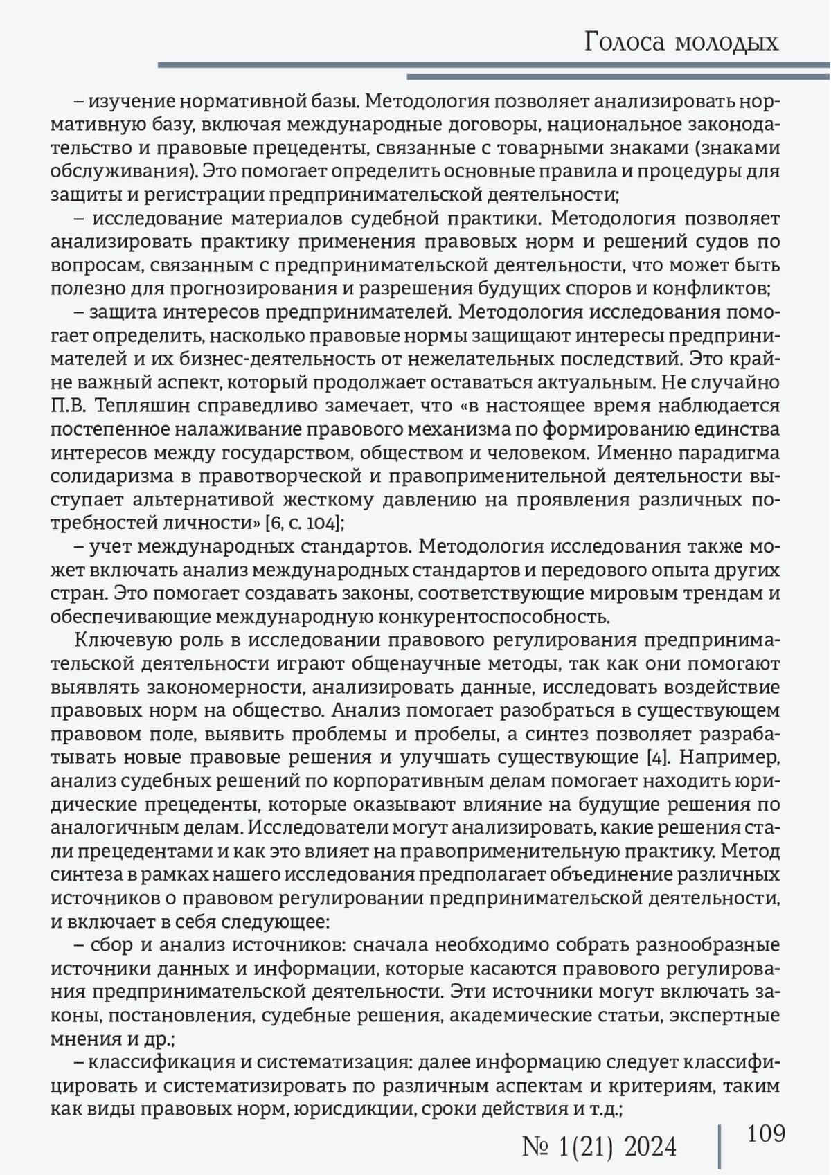 В статье раскрывается методология исследования правового регулирования в области предпринимательской деятельности. Рассматриваются общенаучные методы, включающие в себя такие методы, как анализ, применяемый в исследовании судебной практики, синтез, который помогает в объединении, обобщении и обзоре различных источников информации для полноты представления о правовом регулировании предпринимательской деятельности. В проведении исследования также используются межотраслевые методы: историко-правовой, направленный на изучение этапов развития и формирования законодательства, регулирующего предпринимательскую деятельность, и статистический, служащий для анализа и сбора статистики относительно темы исследования. Для сравнения зарубежного и российского законодательства используется компаративистский метод, а для толкования понятий по данной теме исследования, а также норм права - метод юридического толкования.