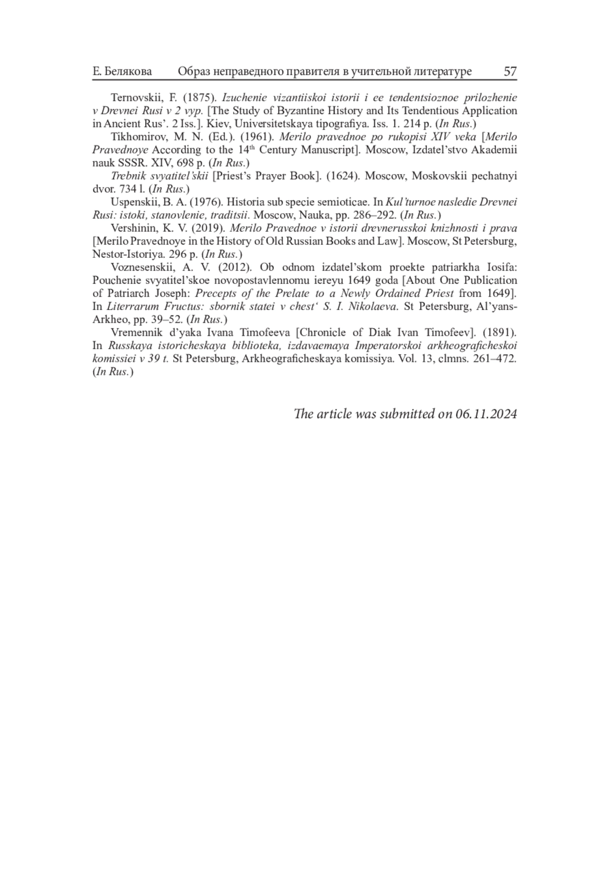 3. Белякова Е. В. К истории распространения Поучения новопоставленному священнику // Slavica Slovaca. 2023b. R. 58. Č. 2. S. 349-357. DOI: 10.31577/SlavSlov.2023.2.18 EDN: EFKKFH