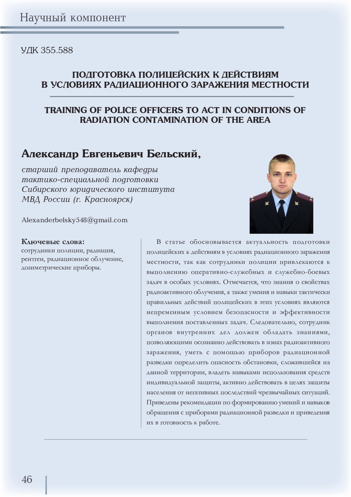 В статье обосновывается актуальность подготовки полицейских к действиям в условиях радиационного заражения местности, так как сотрудники полиции привлекаются к выполнению оперативно-служебных и служебно-боевых задач в особых условиях. Отмечается, что знания о свойствах радиоактивного облучения, а также умения и навыки тактически правильных действий полицейских в этих условиях являются непременным условием безопасности и эффективности выполнения поставленных задач. Следовательно, сотрудник органов внутренних дел должен обладать знаниями, позволяющими осознанно действовать в зонах радиоактивного заражения, уметь с помощью приборов радиационной разведки определить опасность обстановки, сложившейся на данной территории, владеть навыками использования средств индивидуальной защиты, активно действовать в целях защиты населения от негативных последствий чрезвычайных ситуаций. Приведены рекомендации по формированию умений и навыков обращения с приборами радиационной разведки и приведения их в готовность к работе.