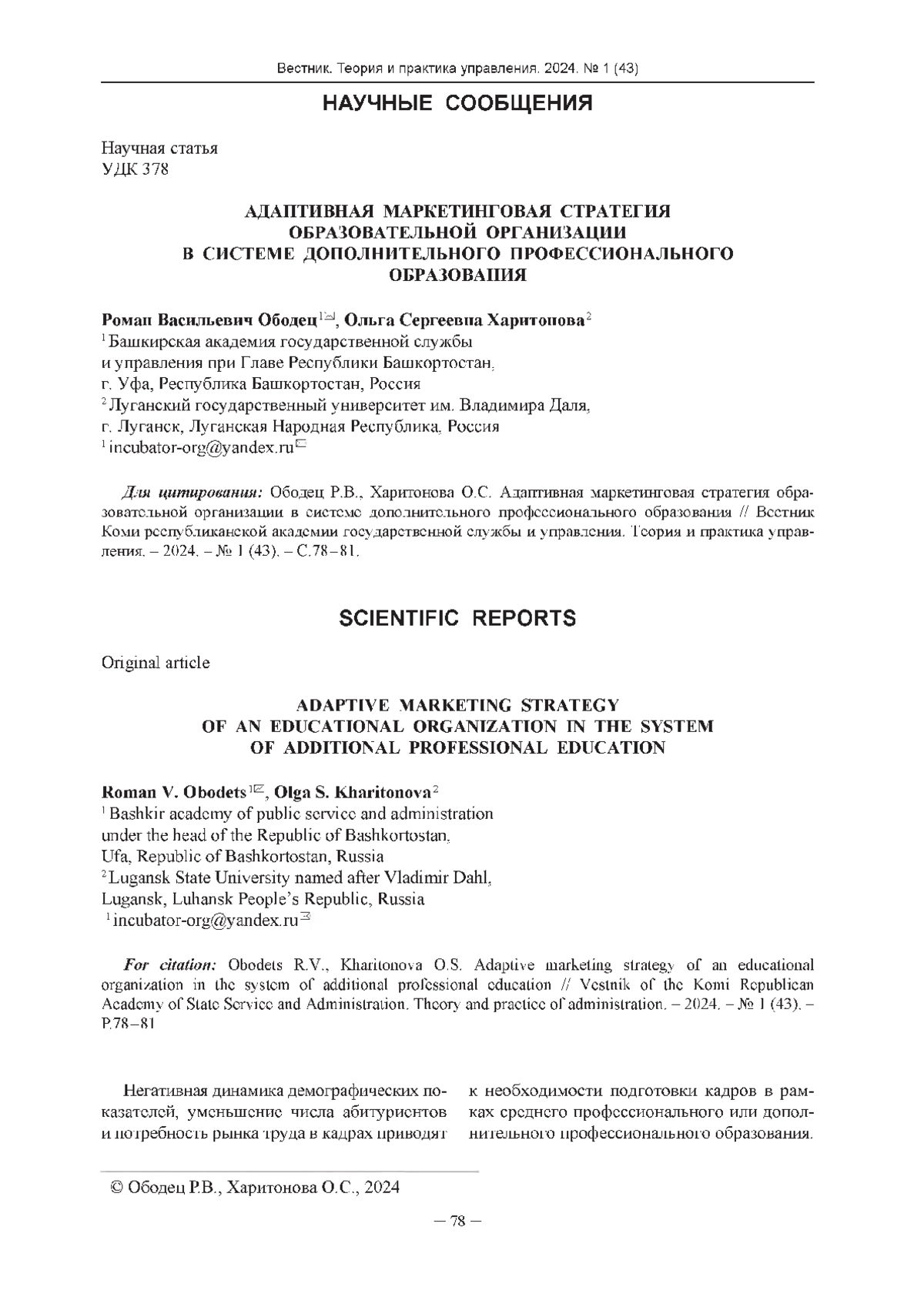 3. Костровец Л.Б., Ободец Р.В. Проблемы и перспективы подготовки кадров для системы государственного и муниципального управления в условиях Донецкой Народной Республики // Менеджер. - 2022. - № 4 (102). - С.49-54. - -EDN. DOI: 10.5281/zenodo.7441988 EDN: DVDUII