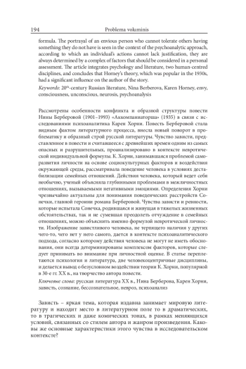 Рассмотрены особенности конфликта и образной структуры повести Нины Берберовой (1901-1993) «Аккомпаниаторша» (1935) в связи с исследованиями психоаналитика Карен Хорни. Повесть Берберовой стала видным фактом литературного процесса, внесла новый поворот в проблематику и образный строй русской литературы. Чувство зависти, представленное в повести и считавшееся с древнейших времен одним из самых опасных и разрушительных, проанализировано в контексте невротической индивидуальной формулы. К. Хорни, занимавшаяся проблемой саморазвития личности на основе социокультурных факторов и воздействия окружающей среды, рассматривала поведение человека в условиях дестабилизации семейных отношений. Действия человека, который ведет себя необычно, ученый объясняла глубинными проблемами в межличностных отношениях, вызываемыми негативными эмоциями. Определения Хорни чрезвычайно актуальны для понимания поведенческих расстройств Сонечки, главной героини романа Берберовой. Чувства зависти и ревности, которые испытала Сонечка, родившаяся и живущая в тяжелых жизненных обстоятельствах, так и не сумевшая преодолеть отчуждение в семейных отношениях, можно объяснить именно формулой невротической личности. Изображение завистливого человека, не терпящего наличия у других чего-то, чего нет у него самого, дается в контексте психоаналитического подхода, согласно которому действия человека не могут не иметь обоснования, они всегда детерминированы комплексом факторов, которые следует принимать во внимание при личностной оценке. В статье переплетаются психология и литература, две человекоцентричные дисциплины, и делается вывод о безусловном воздействии теории К. Хорни, популярной в 30-е гг. XX в., на творчество автора повести.