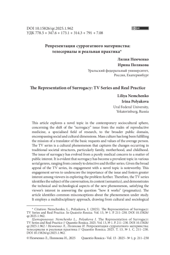 Статья посвящена появлению в современном социокультурном пространстве новой темы, связанной с выходом проблемы суррогатного материнства из медицинского поля исследований (репродуктивной медицины) в общедоступное (общественно-культурное). Массовая культура давно выполняет миссию транслятора основных запросов среднестатистического человека. Сериал как явление массовой культуры фиксирует изменения, происходящие в устойчивых традиционных формах бытования социума, в частности семьи, материнства и детства. Суррогатное материнство на наших глазах перестает быть исключительно специальной проблемой медицинской сферы и приобретает публичный характер. Нельзя не отметить, как оно становится предметом различных сериальных жанров – от комедии до детектива и триллера. Поскольку телесериал ориентирован на широкие слои аудитории, само обращение к новой теме указывает на ее значимость и усиливает интерес зрителя к обсуждению проблемы.