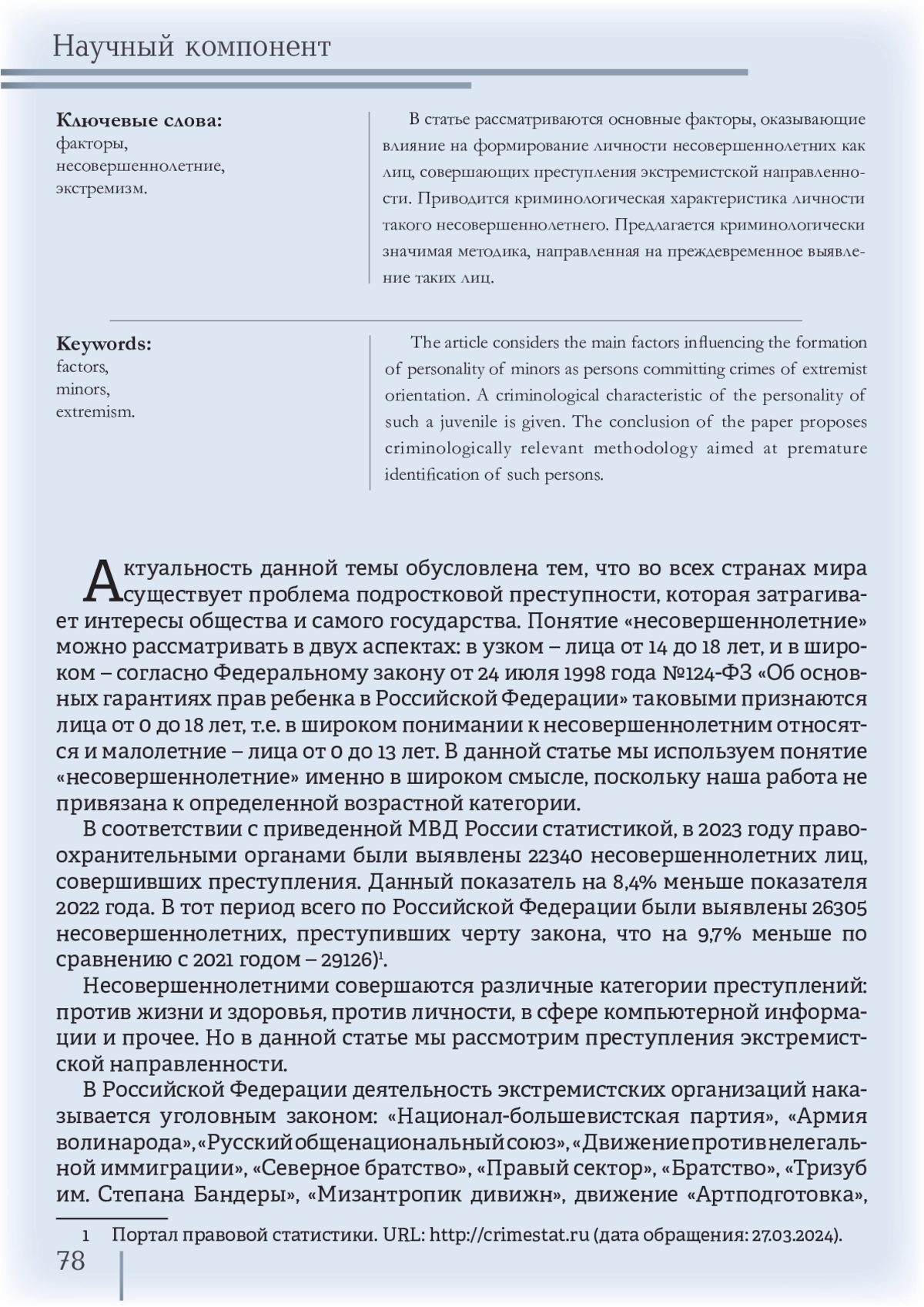 Актуальность данной темы обусловлена тем, что во всех странах мира существует проблема подростковой преступности, которая затрагивает интересы общества и самого государства. Понятие «несовершеннолетние» можно рассматривать в двух аспектах: в узком – лица от 14 до 18 лет, и в широком – согласно Федеральному закону от 24 июля 1998 года №124-ФЗ «Об основных гарантиях прав ребенка в Российской Федерации» таковыми признаются лица от 0 до 18 лет, т. е. в широком понимании к несовершеннолетним относятся и малолетние – лица от 0 до 13 лет. В данной статье мы используем понятие «несовершеннолетние» именно в широком смысле, поскольку наша работа не привязана к определенной возрастной категории.