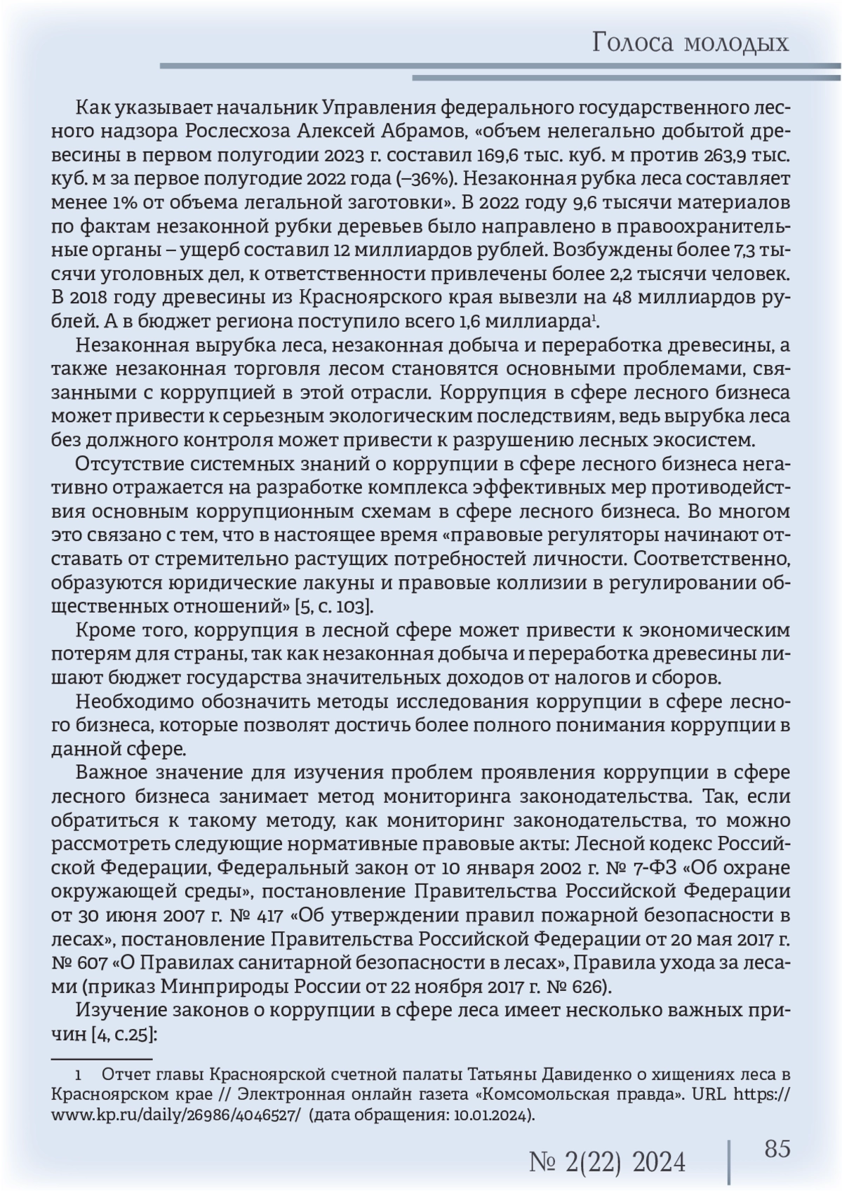 На сегодняшний день проблема коррупции в сфере лесного бизнеса остаётся крайне актуальной как на мировом уровне, так и в России. Коррупция является объектом пристального исследования со стороны ведущих ученых. Так, И. А. Дамм считает, что «именно преступные формы проявления коррупции угрожают системообразующим ценностям как на индивидуальном, так и на национальном уровне» [2, с. 560].