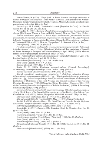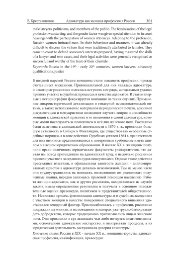 30. Kрестьянников E. A. Политические сигналы женской адвокатуры в поздней Российской империи // Cahiers du Monde russe. 2023. Vol. 64. No. 3-4. P. 619-644. DOI: 10.4000/monderusse.14114 EDN: TRTXEA