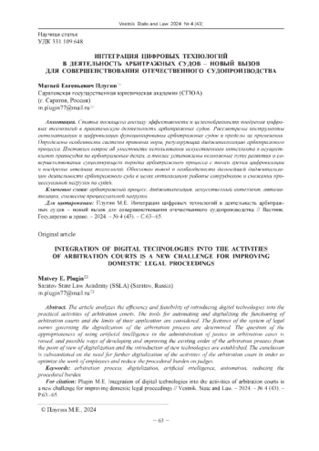 Статья посвящена анализу эффективности и целесообразности внедрения цифровых технологий в практическую деятельность арбитражных судов. Рассмотрены инструменты автоматизации и цифровизации функционирования арбитражных судов и пределы их применения. Определены особенности системы правовых норм, регулирующих диджитализацию арбитражного процесса. Поставлен вопрос об уместности использования искусственного интеллекта в осуществлении правосудия по арбитражным делам, а также установлены возможные пути развития и совершенствования существующего порядка арбитражного процесса с точки зрения цифровизации и внедрения новейших технологий. Обоснован вывод о необходимости дальнейшей диджитализации деятельности арбитражного суда в целях оптимизации работы сотрудников и снижения процессуальной нагрузки на судей.