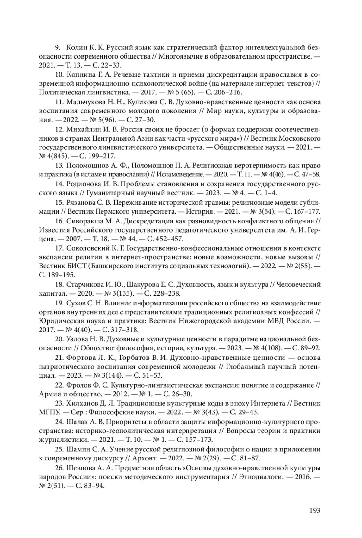 8. Колин К. К. Духовная культура в парадигме национальной безопасности. - Челябинск: Челябинская государственная академия культуры и искусств, 2011. - С. 175-195. EDN: HWJGCT