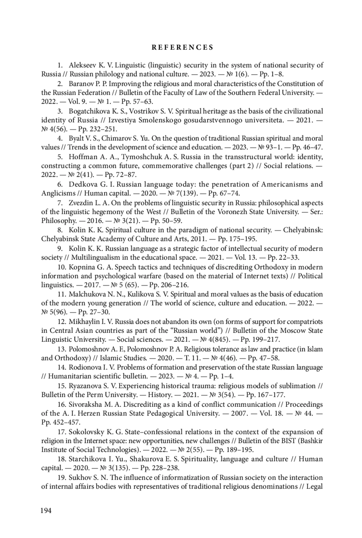 9. Колин К. К. Русский язык как стратегический фактор интеллектуальной безопасности современного общества // Многоязычие в образовательном пространстве. - 2021. - Т. 13. - С. 22-33. EDN: TJDYZX