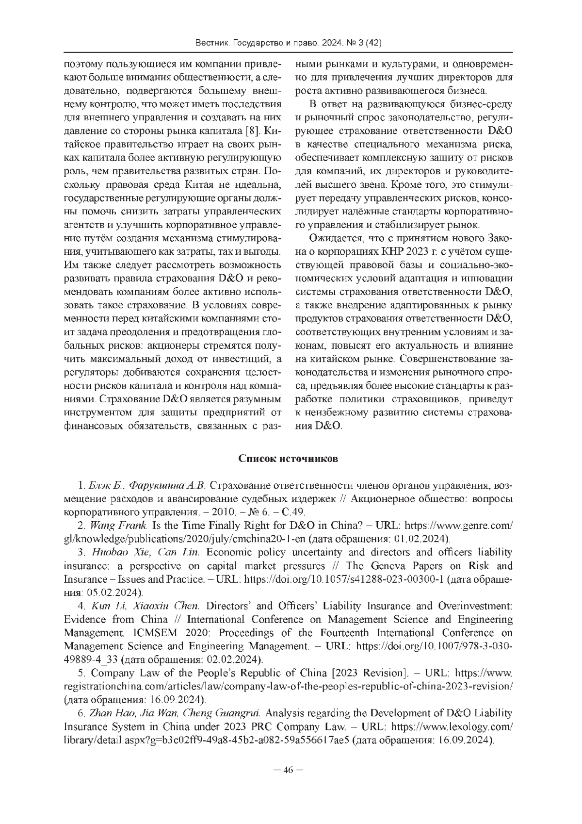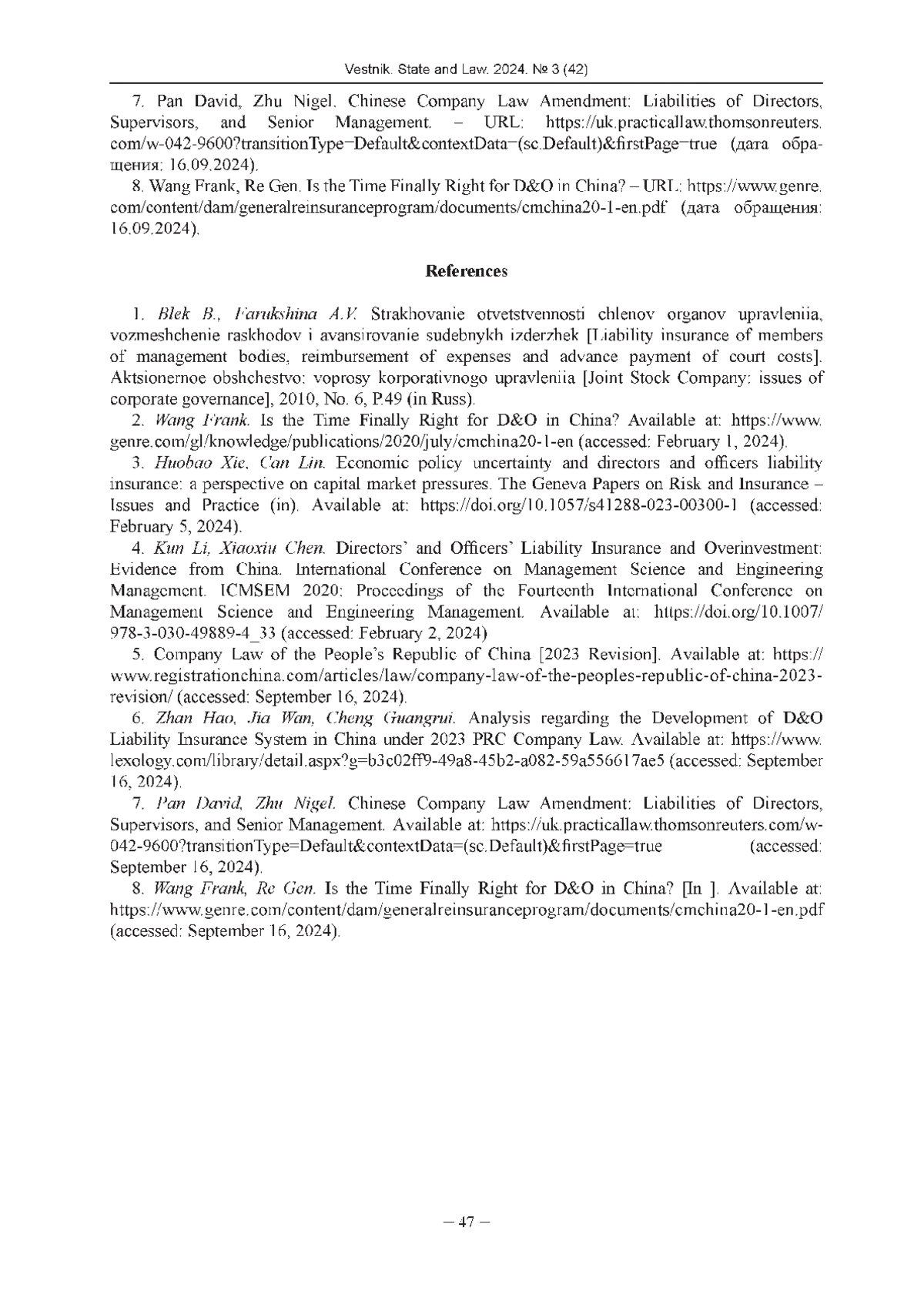 ОСИПОВА Л. В., РЕШЕТНИКОВА Е. В. ОПЫТ КИТАЯ В СТРАХОВАНИИ ОТВЕТСТВЕННОСТИ ДИРЕКТОРОВ: НОВЫЙ ПОДХОД В ЗАКОНЕ О КОРПОРАЦИЯХ КИТАЙСКОЙ НАРОДНОЙ РЕСПУБЛИКИ 2023 Г // ВЕСТНИК. ГОСУДАРСТВО И ПРАВО. 2024. № 3 (42)