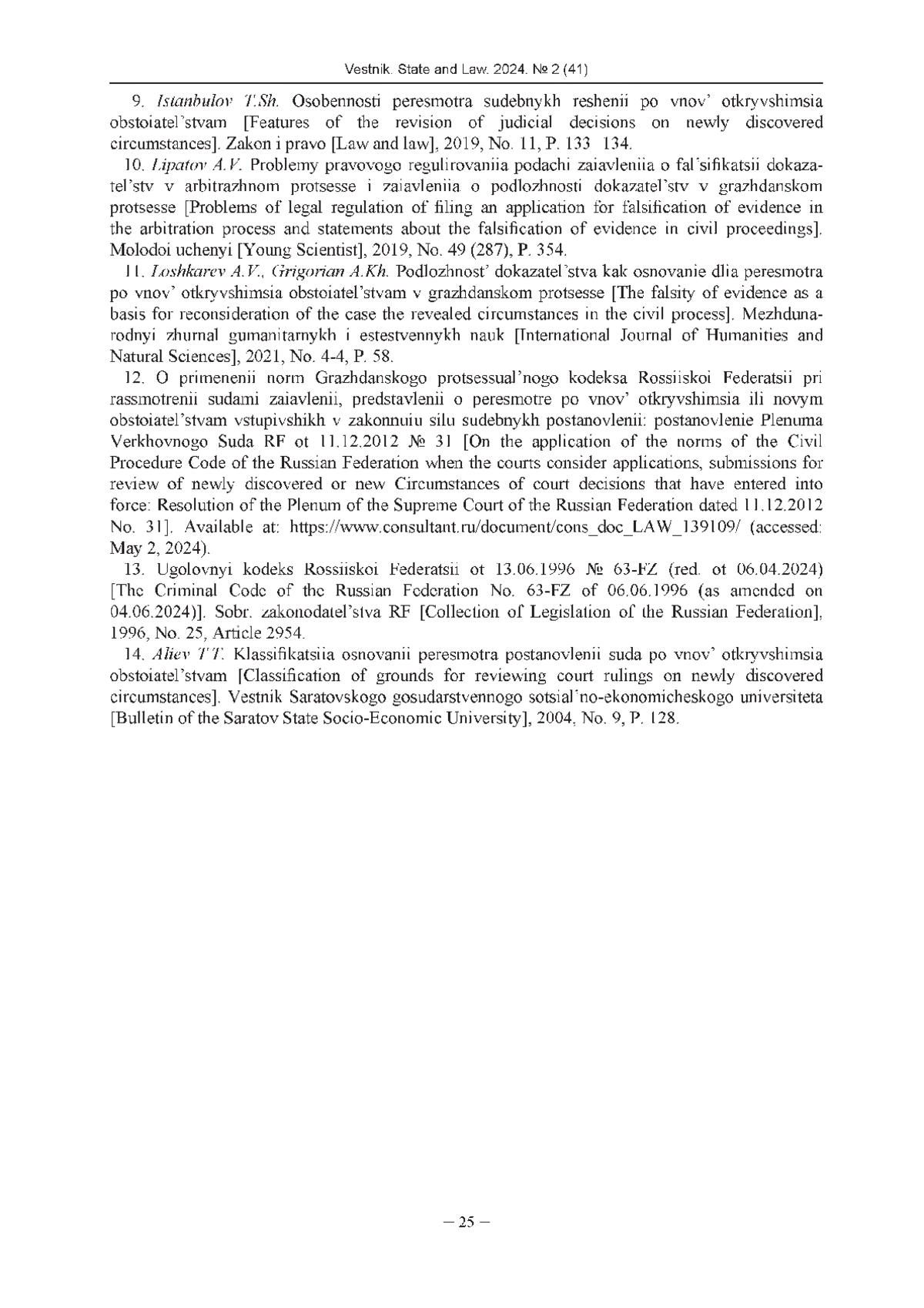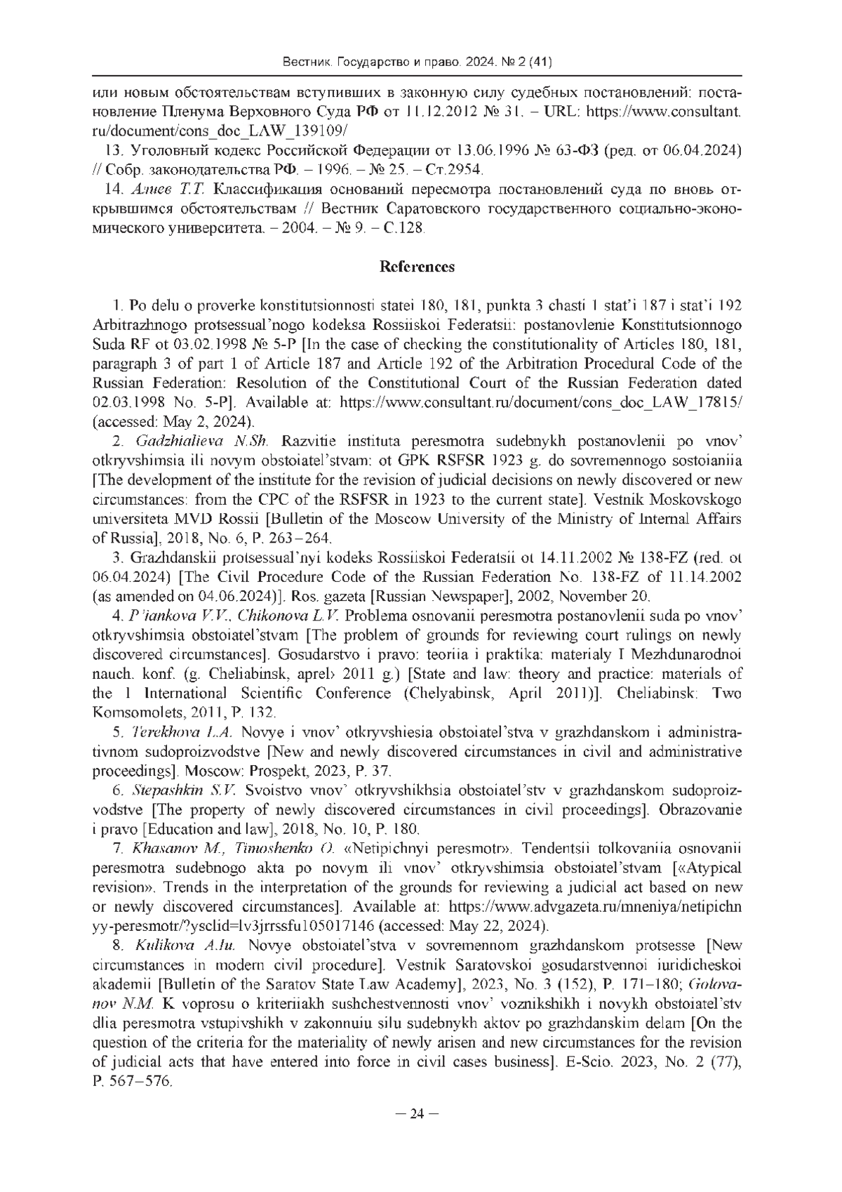 КУРОВА Н. Н., МАКСИМОВ М. А. ВНОВЬ ОТКРЫВШИЕСЯ ОБСТОЯТЕЛЬСТВА КАК ОСНОВАНИЯ ДЛЯ ПЕРЕСМОТРА СУДЕБНЫХ АКТОВ В ГРАЖДАНСКОМ ПРОЦЕССЕ // ВЕСТНИК. ГОСУДАРСТВО И ПРАВО. 2024. № 2 (41)