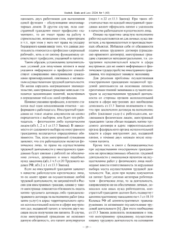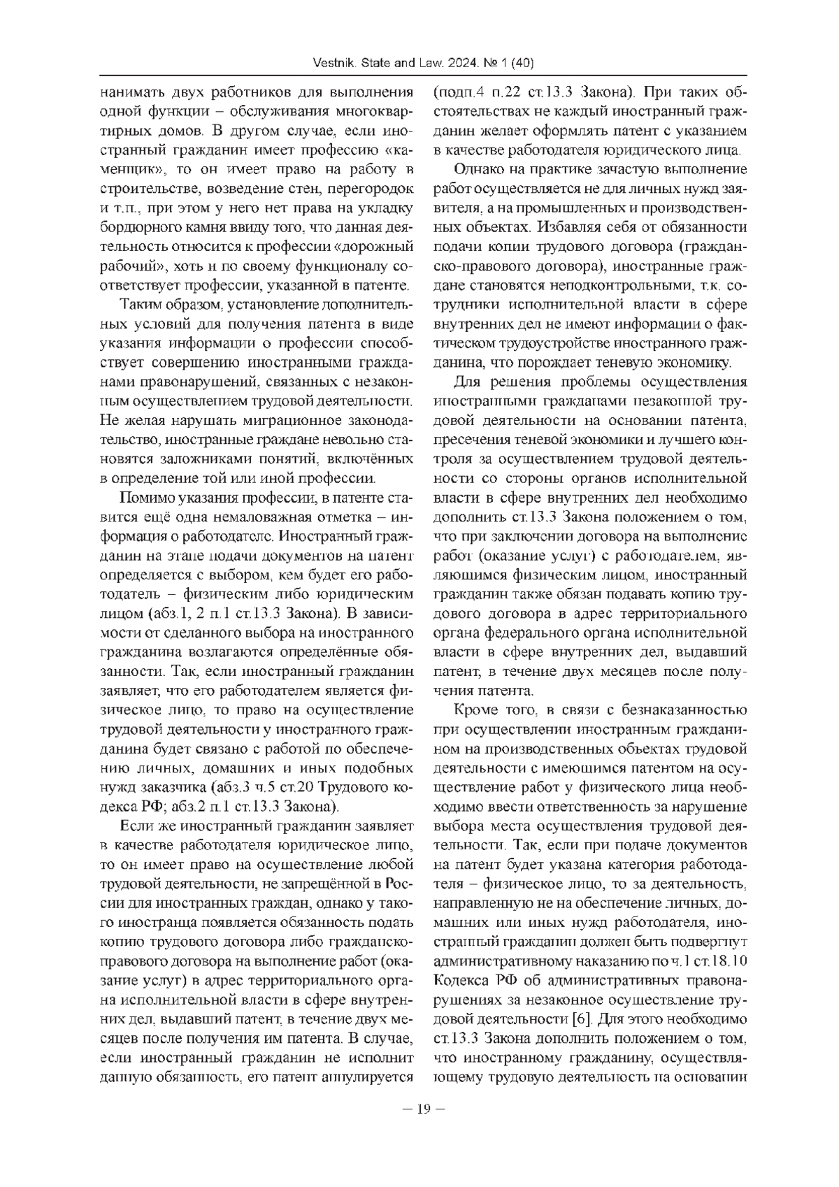В статье рассматриваются особенности трудовой деятельности иностранных граждан, трудящихся в России на основании патента. Отмечается проблема зачастую неправильного выбора иностранным гражданином как профессии, когда в патенте предусмотрено её обязательное указание, так и работодателя, когда вместо юридического лица в патенте указывается работодатель -физическое лицо, что влечёт за собой нарушения миграционного законодательства, связанные с незаконной трудовой деятельностью на территории Российской Федерации. В статье акцентируется внимание на вопросе невозможности продления срока временного пребывания для близких родственников, находящихся на иждивении у иностранных работников, осуществляющих трудовую деятельность на основании патента. В качестве решения выявленных проблем предлагаются внесение изменений в действующее миграционное законодательство и меры по оптимизации системы государственного миграционного контроля.