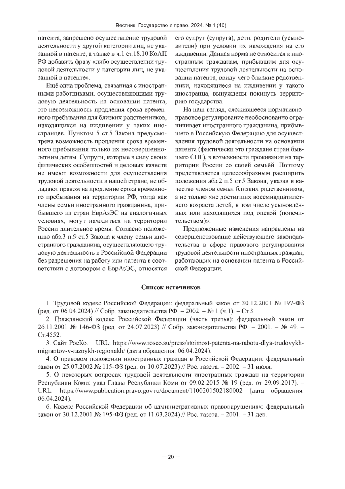 5. О некоторых вопросах трудовой деятельности иностранных граждан на территории Республики Коми: указ Главы Республики Коми от 09.02.2015 № 19 (ред. от 29.09.2017). -URL: https://www.publication.pravo.gov.ru/document/1100201502180002 (дата обращения: 06.04.2024).