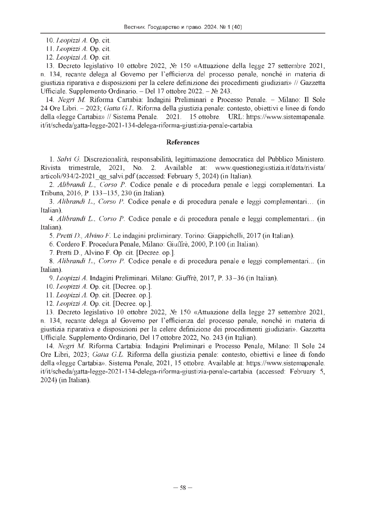 7. Decreto legislativo 10 ottobre 2022, № 150 “Attuazione della legge 27 settembre 2021, n. 134, recante delega al. Governo per l’efficienza del processo penale, nonche in materia di giustizia riparativa e disposizioni per la celere definizione dei procedimenti giudiziari” // Gazzetta Ufficiale. Supplemento Ordinario. - Del 17 ottobre 2022. - № 243.