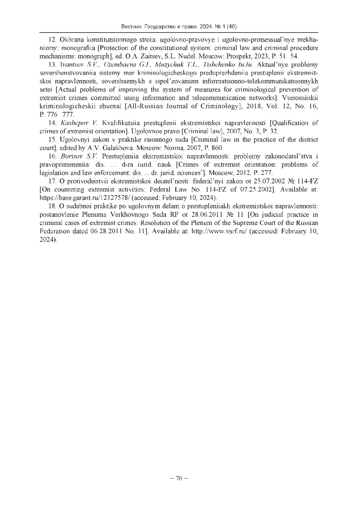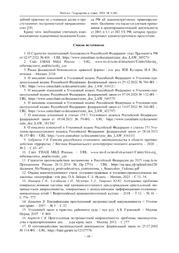 13. Иванцов С.В., Узембаева Г.И., Музычук Т.Л., Тищенко Ю.Ю. Актуальные проблемы совершенствования системы мер криминологического предупреждения преступлений экстремистской направленности, совершаемых с использованием информационно-телекоммуникационных сетей // Всероссийский криминологический журнал. - 2018. - Т.12. - № 16. -С.776-777. EDN: PPLSXR